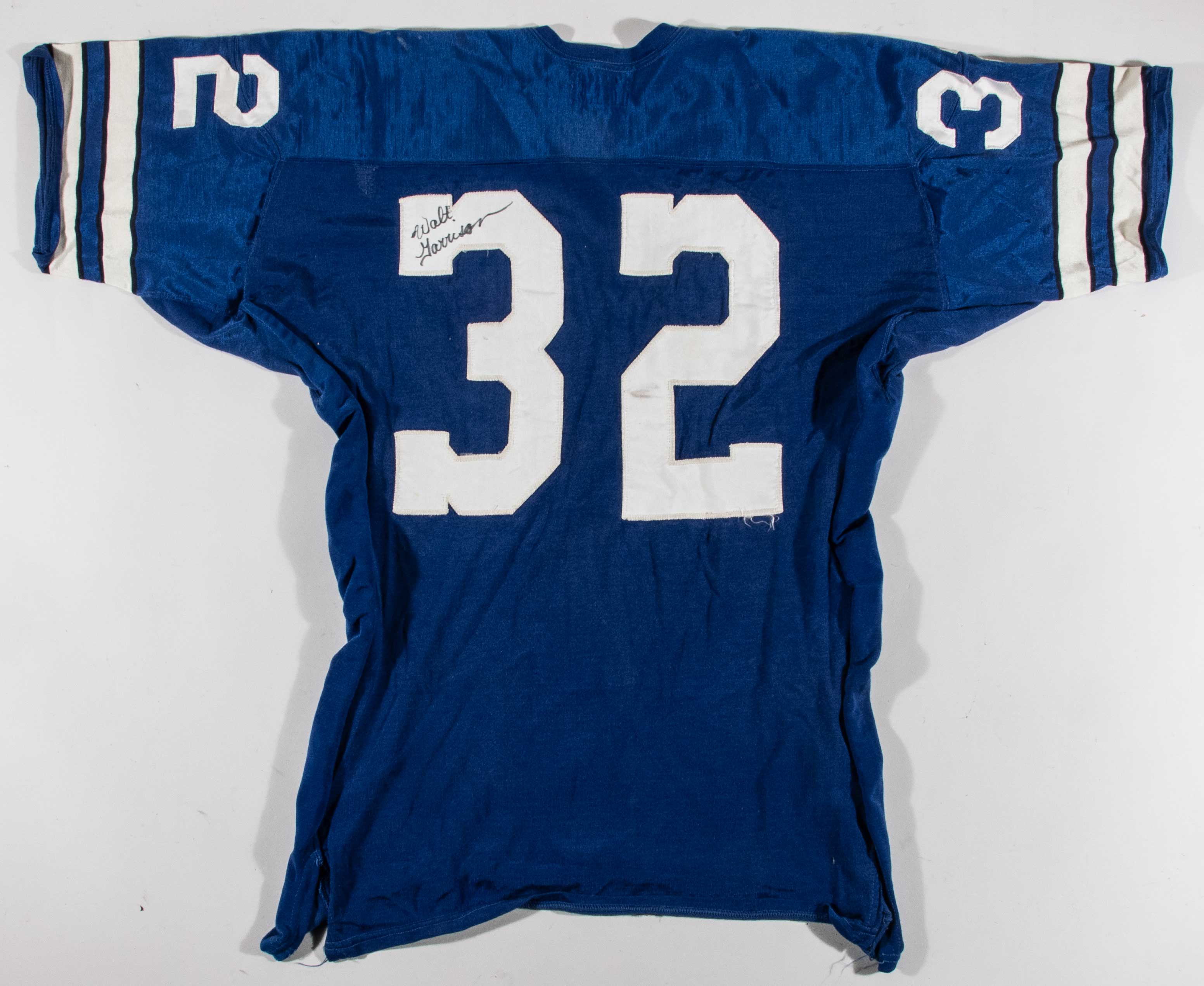 Description:Walt Garrison autographed Dallas Cowboys professional model jersey c.1967-68 (Team repairs). Southland size 48 blue road jersey with #32 sewn on the front, back, and shoulders. Southland tag is sewn inside the collar with attached flag tag noting size, wash instructions, and order number. Garrison signed the jersey in black marker. Signature rates 8 out of 10. Sensational including team repairs on the chest and back. Includes LOA from Hunt Auctions (jersey), and JSA auction LOA (autograph): EX