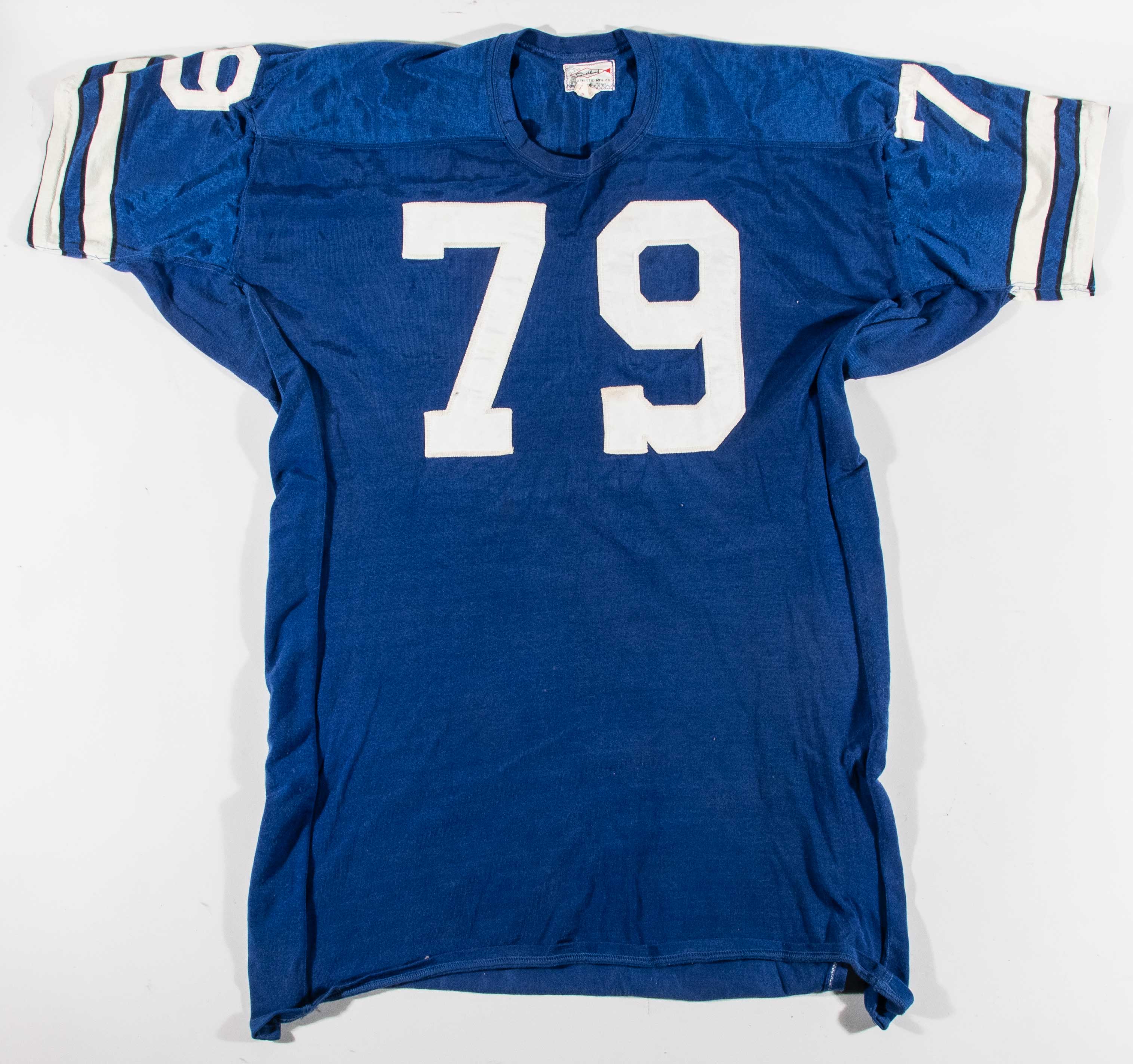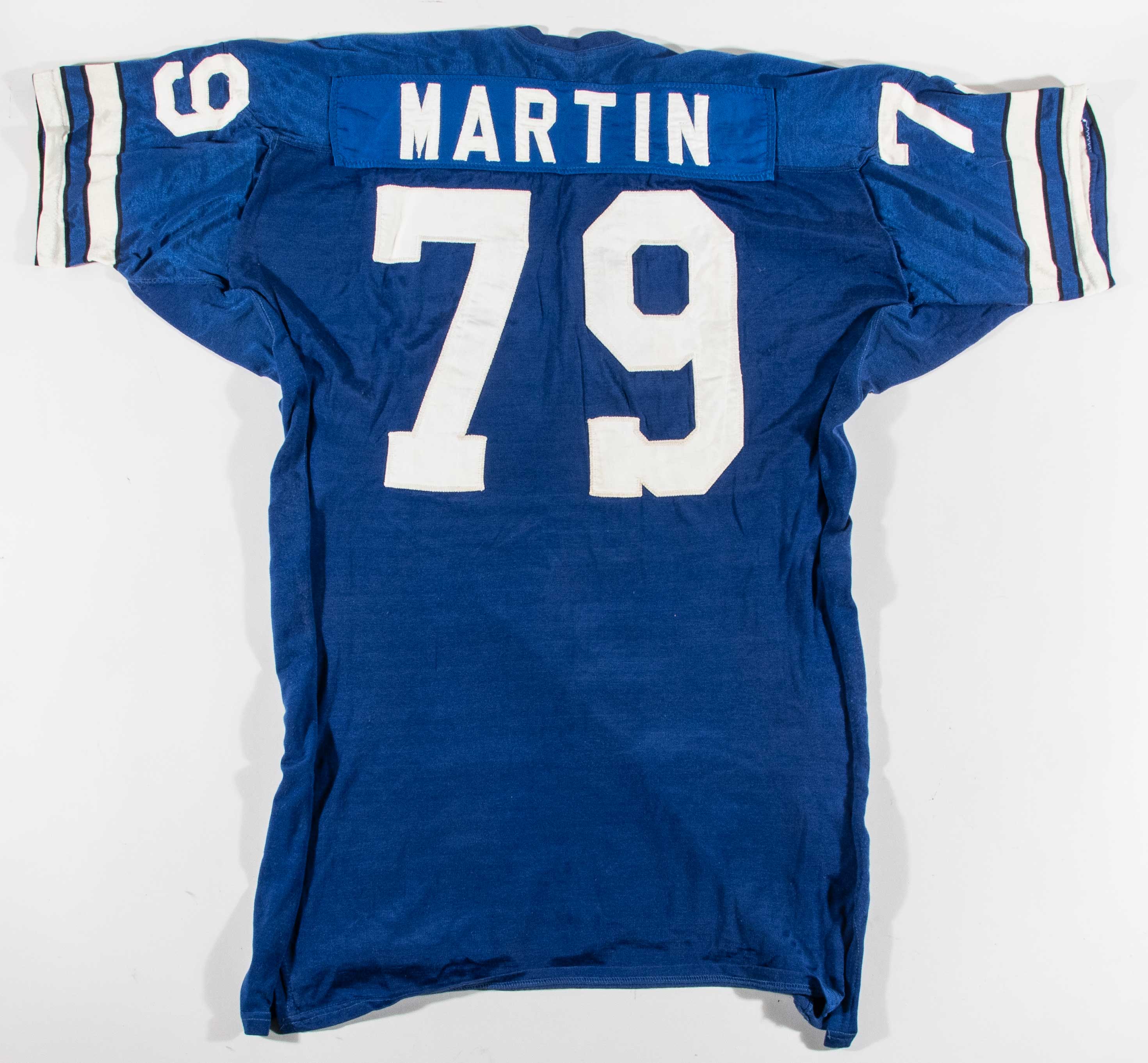 Description:Harvey Martin professional model Dallas Cowboys jersey c.early-mid 1970s (MeiGray LOA). Southland size 50 blue road jersey with "MARTIN" nameplate sewn across the back, along with #79 sewn on the front, back, and shoulders. Southland tag is sewn inside the collar with attached flag tag noting size, wash instructions, and order number. Outstanding use with abrasions on the front, and team repairs and abrasions on the right shoulder. MeiGray authentication confirms that Martin wore the jersey during the early-mid 1970s, and notes that the team wore blue Southland jerseys only (6) times from 1973-1976. Includes MeiGray authentication paperwork: EX