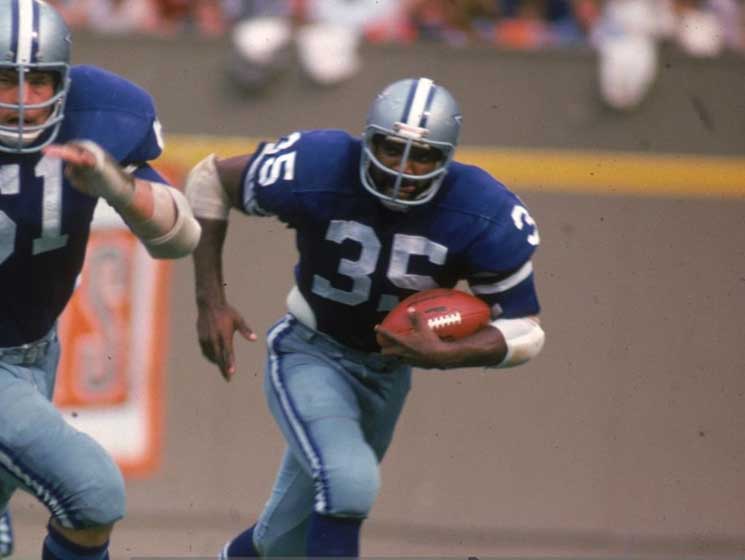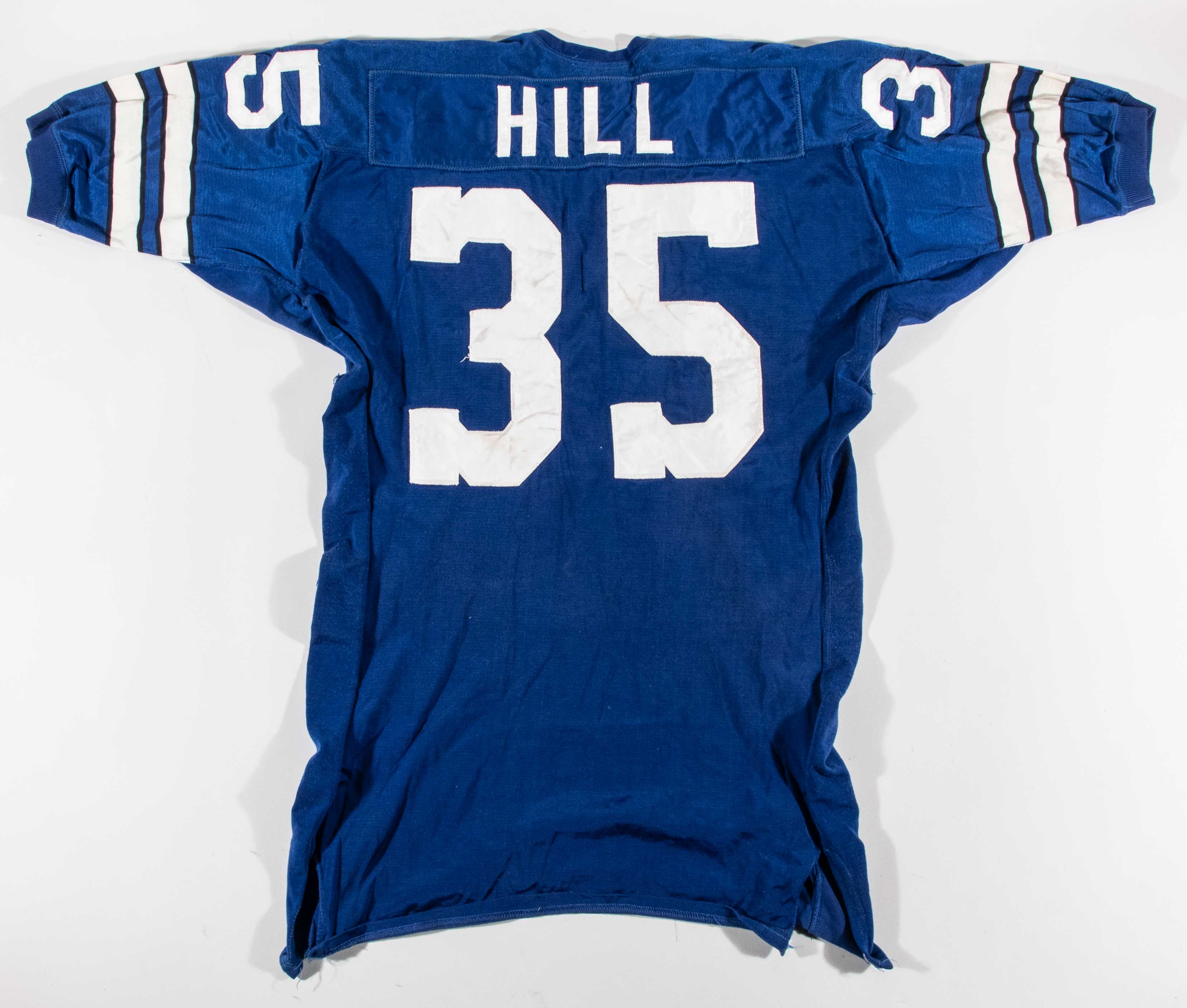 Description:Calvin Hill professional model Dallas Cowboys jersey with hand pouch c.1970-74 (Fine use with team repair). Southland size 48 blue road jersey with "HILL" nameplate sewn across the back, along with #35 sewn on the front, back, and shoulders. A hand pouch is sewn on the front, and Southland tag is sewn inside the collar with attached flag tag noting size, wash instructions, and order number. Sensational use with light number stains, and 1.5" team repair on the back. Includes LOA from Hunt Auctions: EX