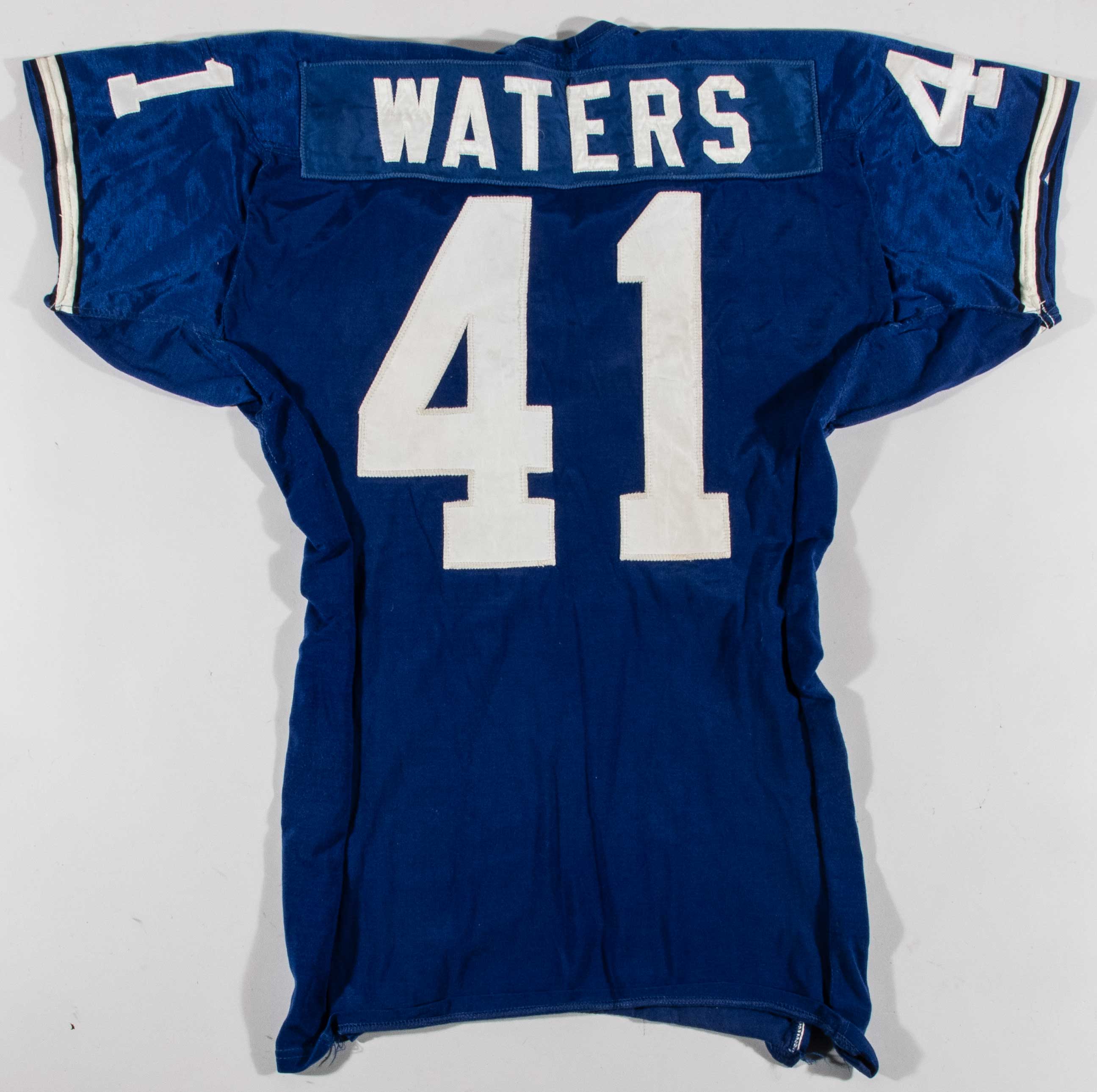 Description:Charlie Waters professional model Dallas Cowboys jersey c.early-mid 1970s. Southland size 44 blue road jersey with "WATERS" nameplate sewn across the back, along with #41 sewn on the front, back, and shoulders. Southland tag is sewn inside the collar with attached flag tag noting size, wash instructions, and order number. Visible use, with custom hemmed sleeves, a few stains, and very supple fabric. Includes LOA from Hunt Auctions: EX