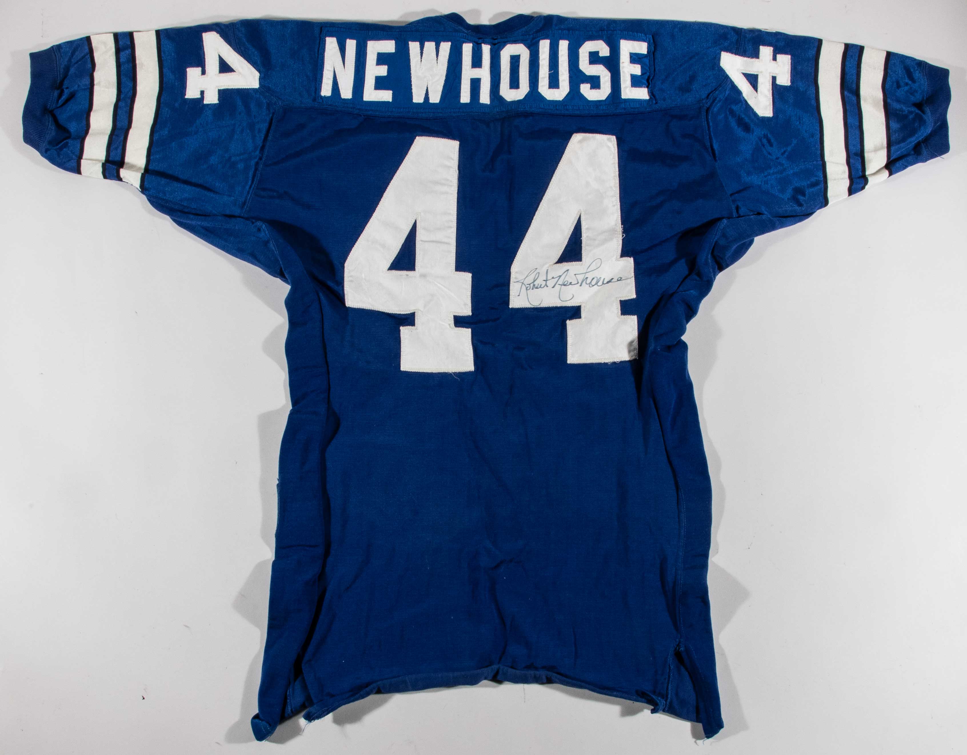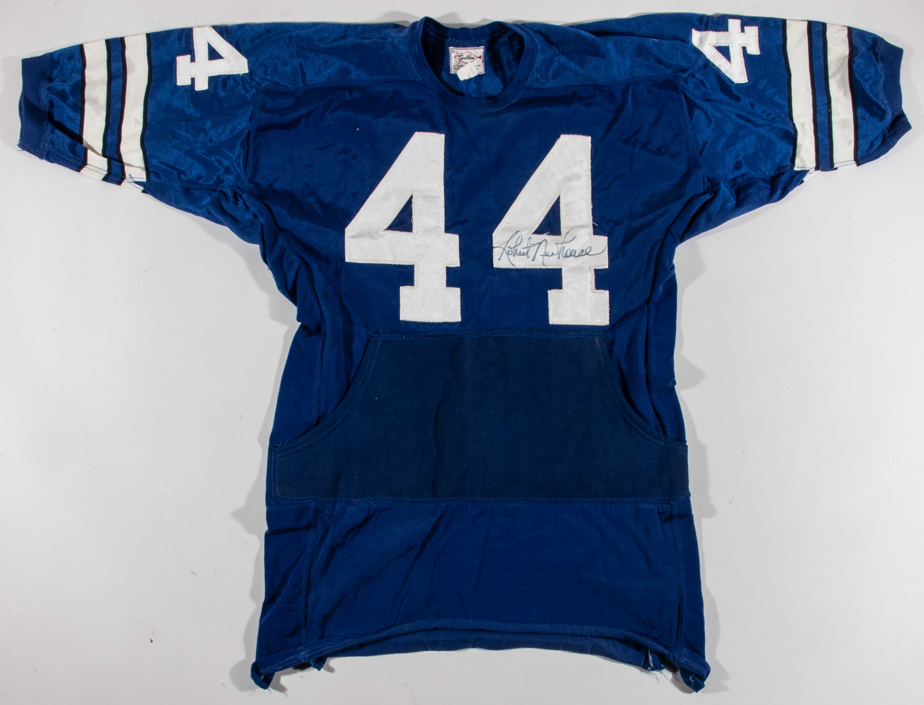 Description:Robert Newhouse autographed Dallas Cowboys professional model jersey with hand pouch c.1973-76 (Team repair). Southland size 48 blue road jersey with "NEWHOUSE" nameplate sewn across the back, along with #44 sewn on the front, back, and shoulders. A hand pouch is sewn on the front, and Southland tag is sewn inside the collar with attached flag tag noting size, wash instructions, and order number. Newhouse signed the jersey in black marker. Signature rates 8 out of 10. Great use with some scattered stains and a team repair on the left shoulder. Includes LOA from Hunt Auctions (jersey), and JSA auction LOA (autograph): EX