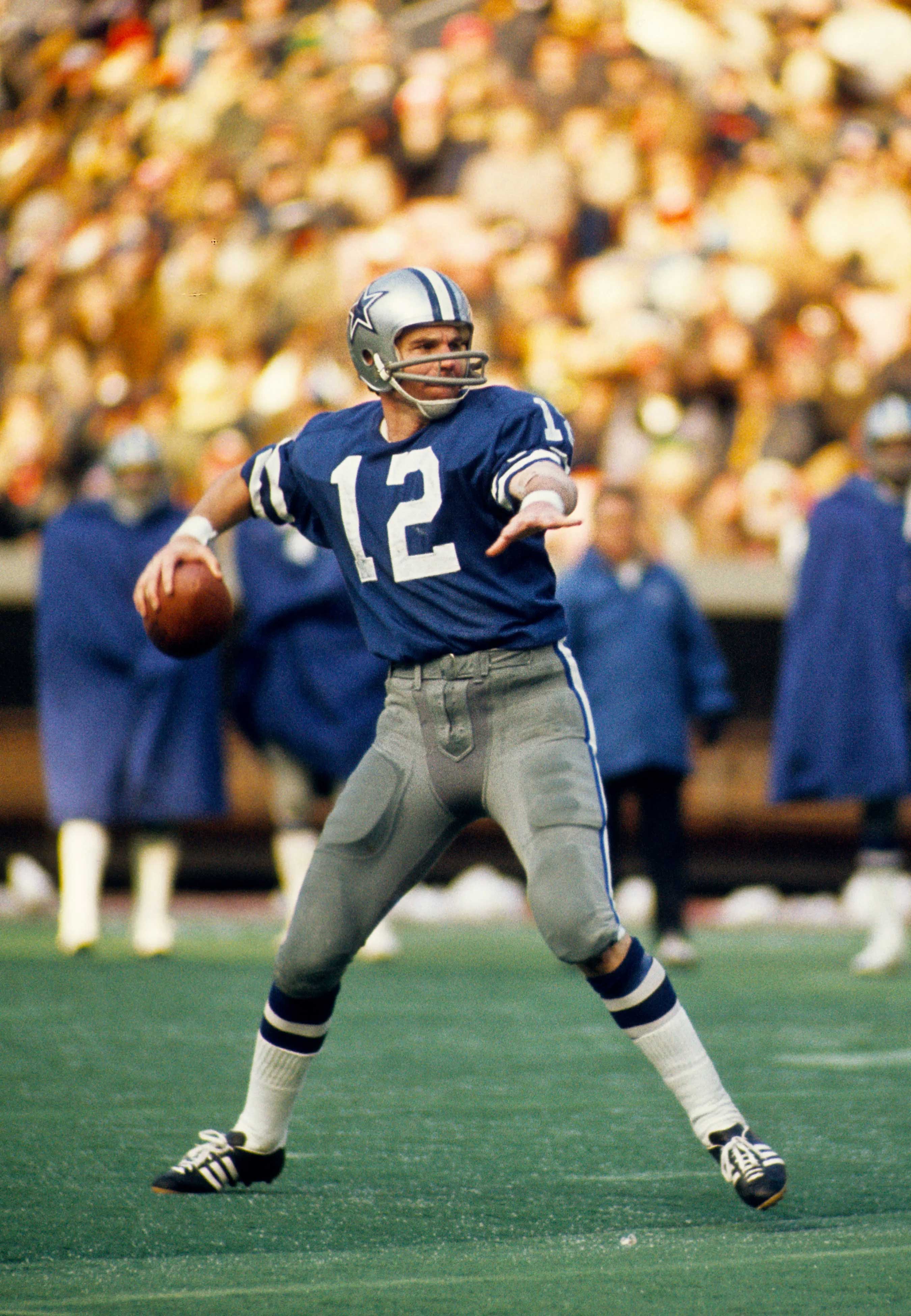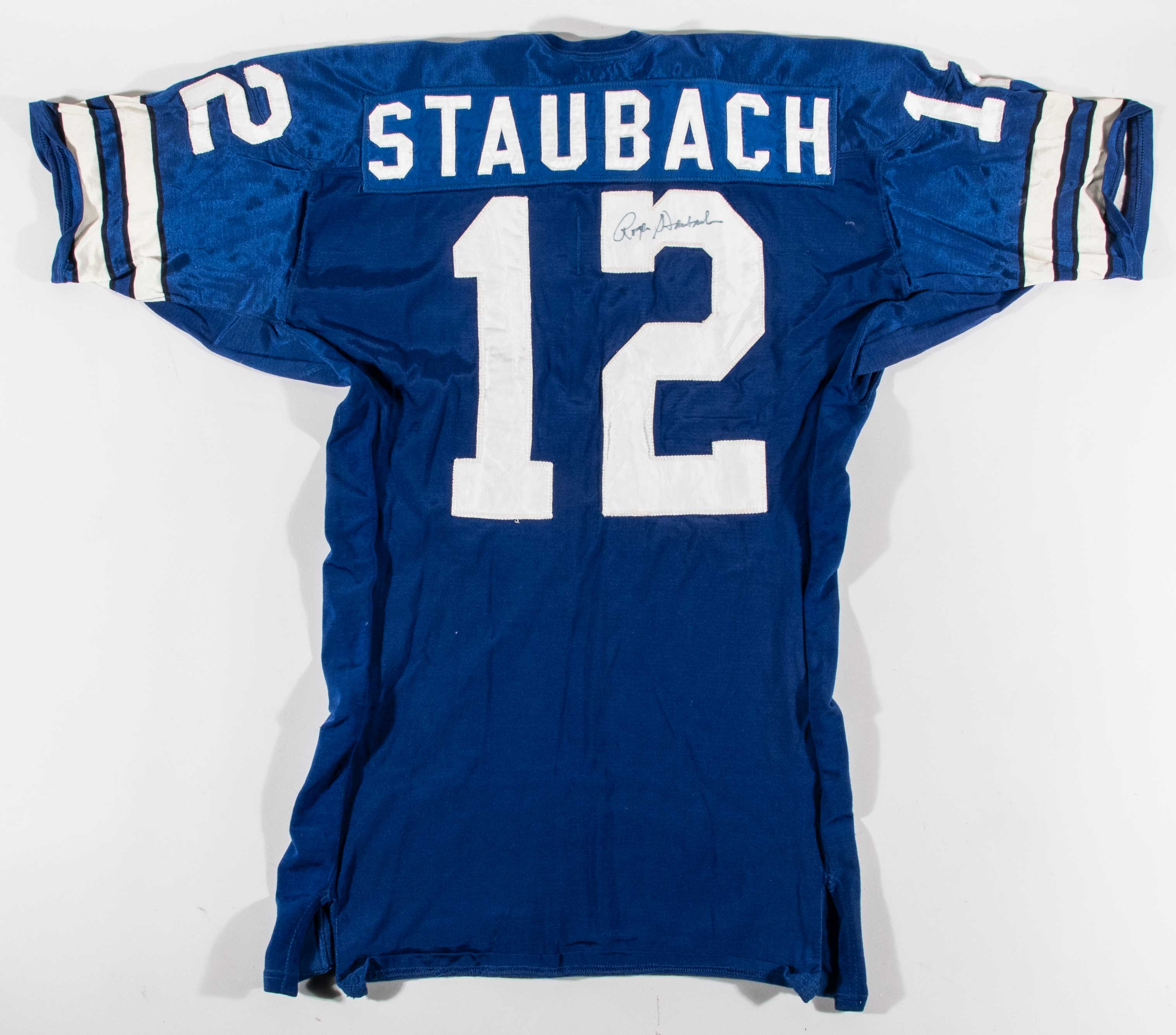 Description:Exceptional Roger Staubach autographed Dallas Cowboys professional model jersey c.1970s (Team repair). Southland size 46 blue road jersey with "STAUBACH" nameplate sewn across the back, along with #12 sewn on the front, back, and shoulders. Southland tag is sewn inside the collar with attached flag tag noting size, wash instructions, and order number. Staubach signed the jersey in blue marker. Signature rates 8 out of 10. Superior use including a 3" team repair on the back, and a small hole on the front. Includes LOA from Hunt Auctions (jersey) and JSA auction LOA (autograph): EX