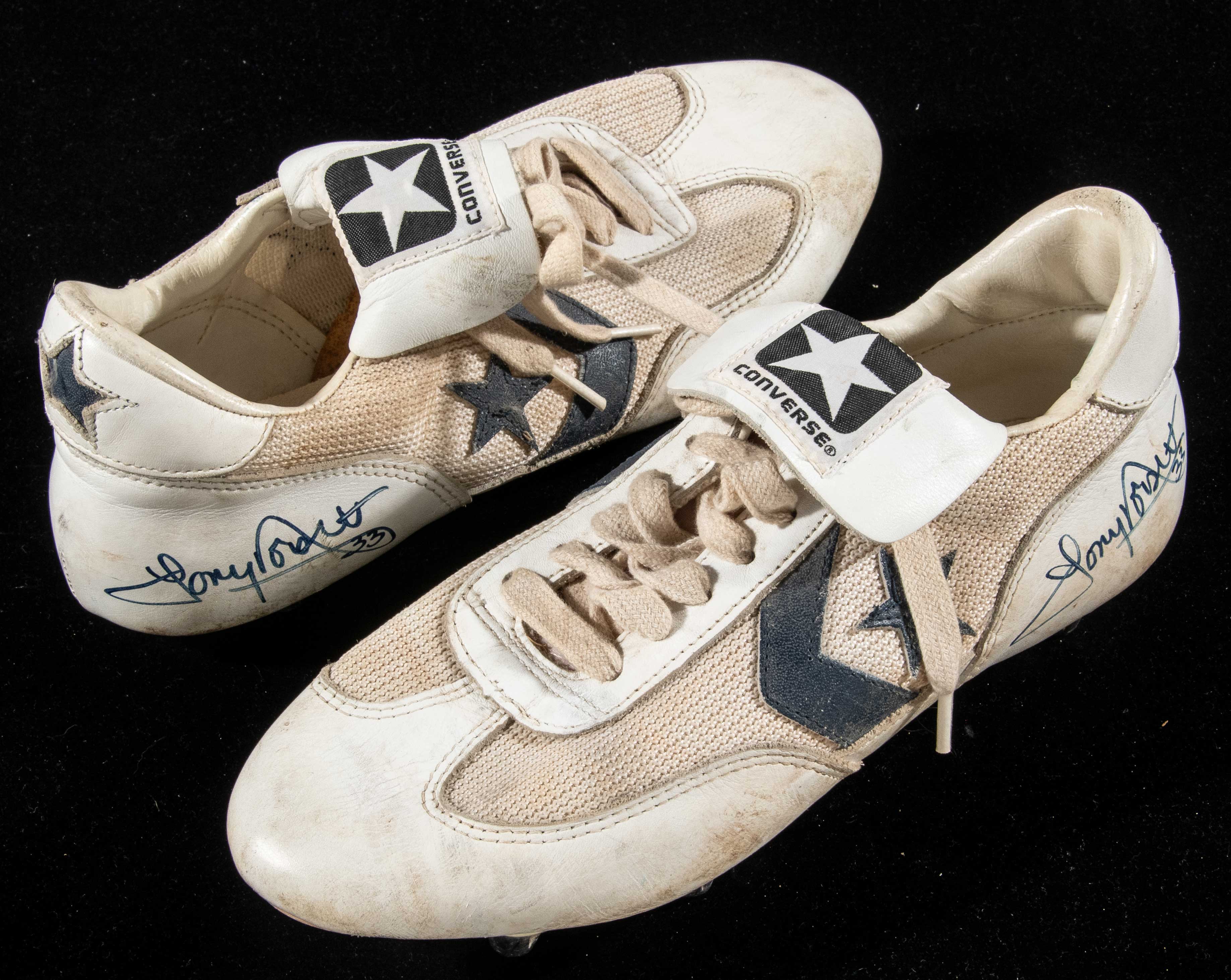 Description:Tony Dorsett autographed professional model football cleats c.1970s-80s. Pair of Converse size 9.5 cleats with #33 written inside of both in black marker. Dorsett signed the exterior of each in blue marker. Signatures rate 8 out of 10. Excellent use with field residue still caked on the bottoms. Includes LOA from Hunt Auctions (cleats), and JSA auction LOA (autographs): EX