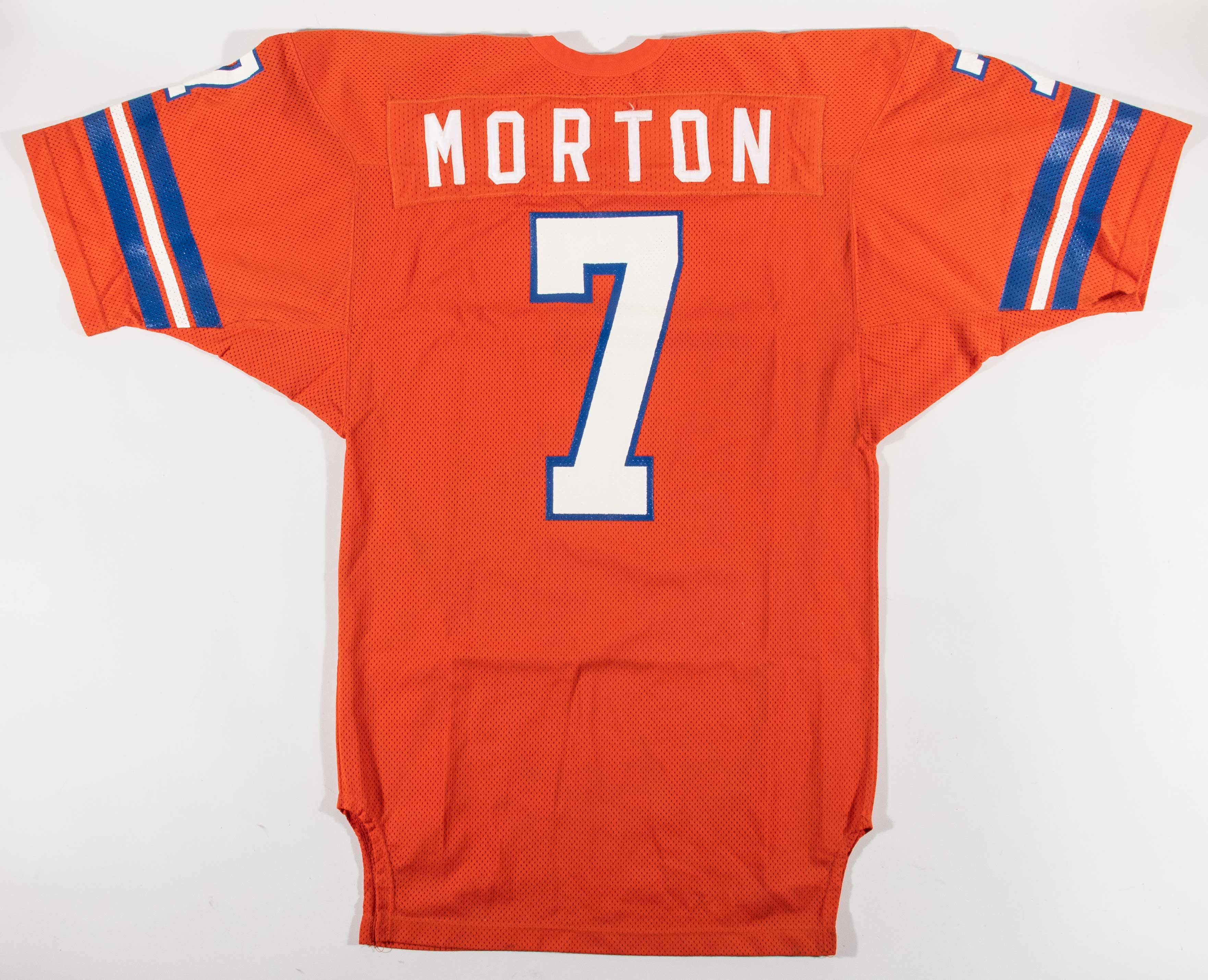 Description:Craig Morton professional model Denver Broncos jersey c.1981-82 (team repairs). Russell Athletic size 44 orange home jersey with "MORTON" nameplate sewn across the back, along with #7 on the front, back, and sleeves, and Rissell Athletic tag sewn on the front tail. Excellent use with scattered stains and team repairs on the chest and right sleeve. Includes LOA from Hunt Auctions: EX