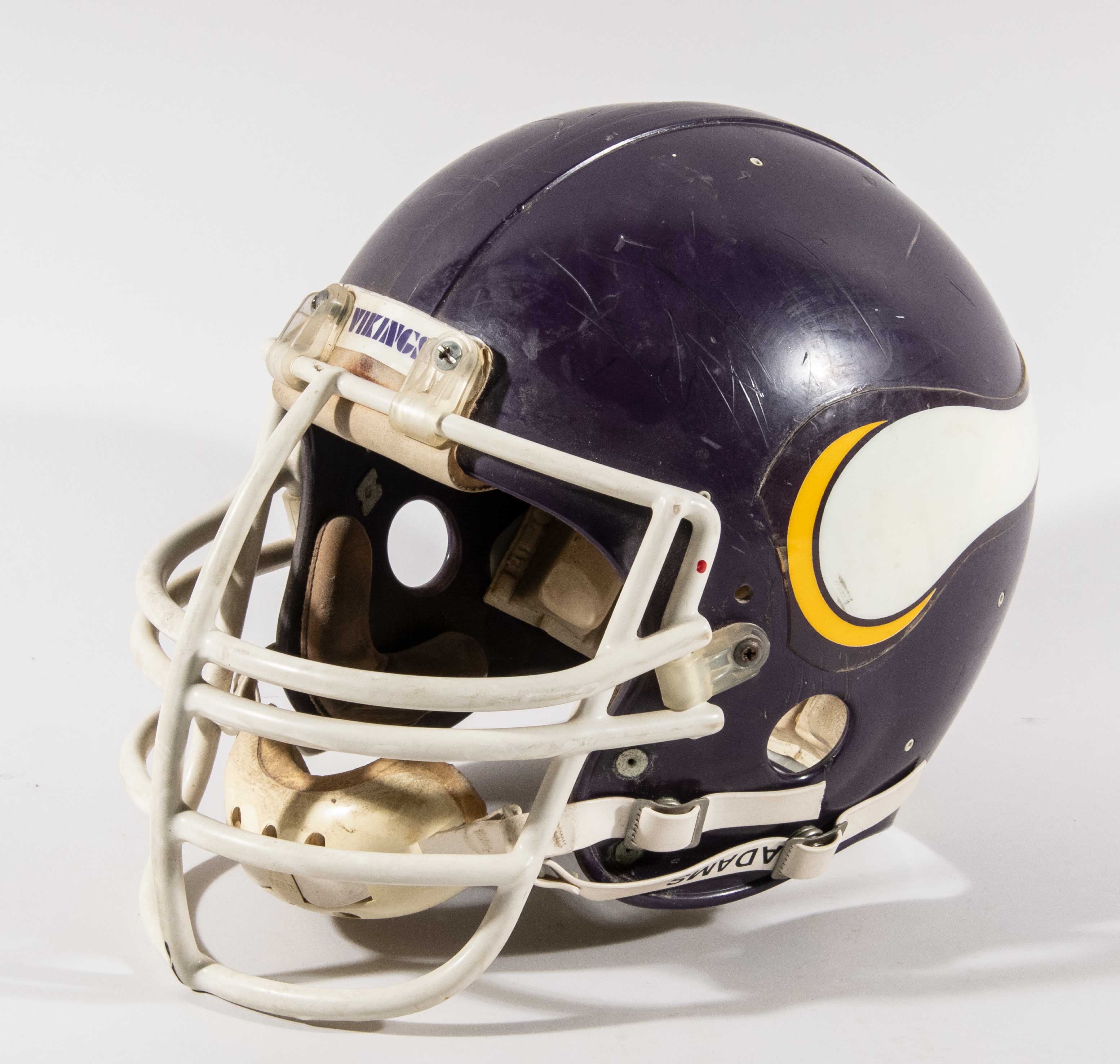 Description:Minnesota Vikings professional model helmet c.early 1980s. Riddell PAC-3 model Vikings helmet with #82 written on the interior Riddell sticker. "2" is above "81" on the inner date code circle, and there is also a "1981" sticker which has been placed inside. Superb use with scratches and scuff marks on the crown. Includes LOA from Hunt Auctions: EX