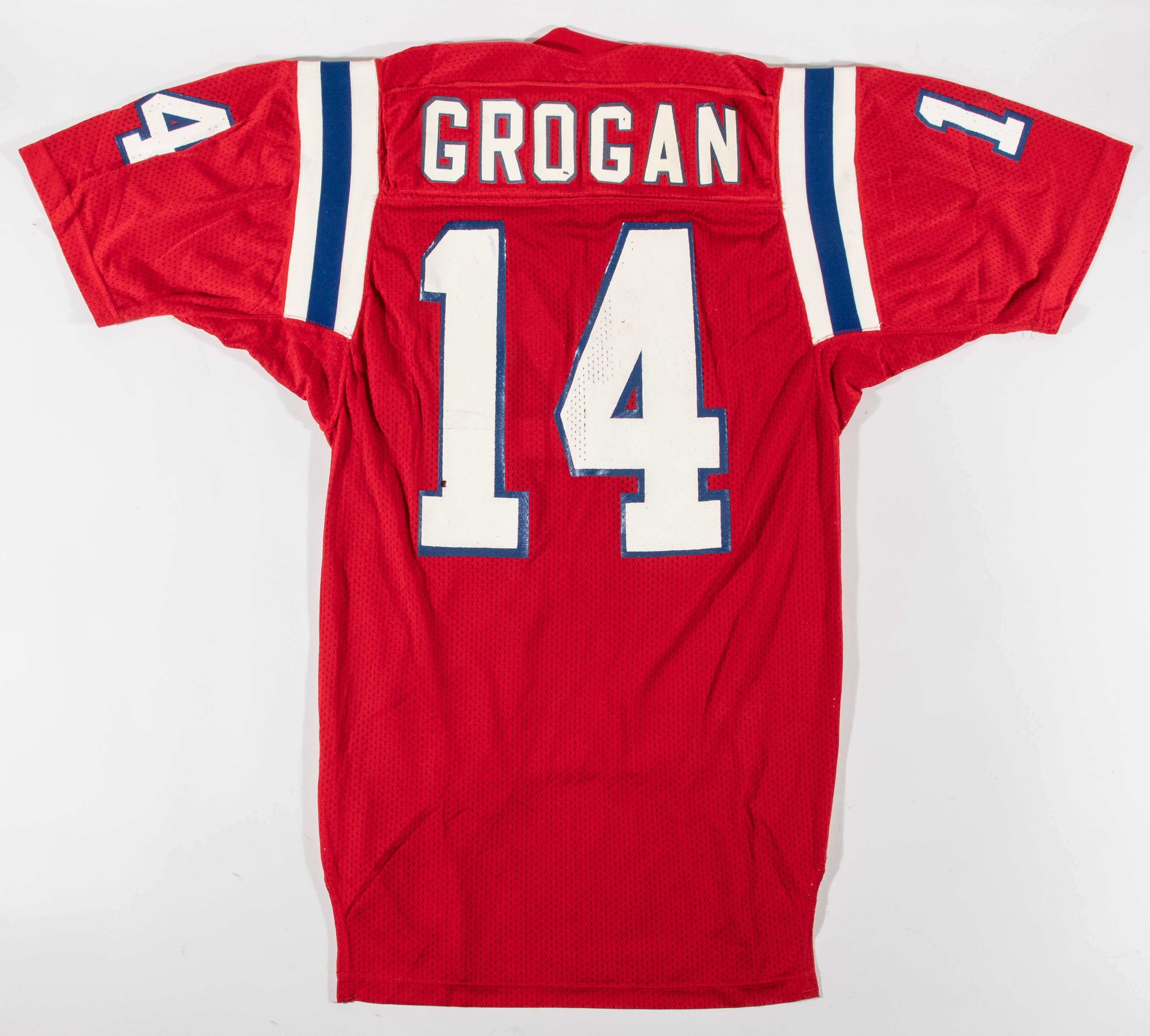 Description:Steve Grogan professional model New England Patriots jersey with hand pouch c.1983. Russell Athletic size 46 red home jersey with "GROGAN" nameplate sewn across the back, along with #14 on the front, back, and sleeves. A hand pouch is sewn on the front, and Russell Athletic tagging is on the front tail with attached flag tag identifying material and wash care. Exceptional use with scuff marks on the numbers and small spots of surface loss/cracks to some of the letters and numbers. Includes LOA from Hunt Auctions: EX