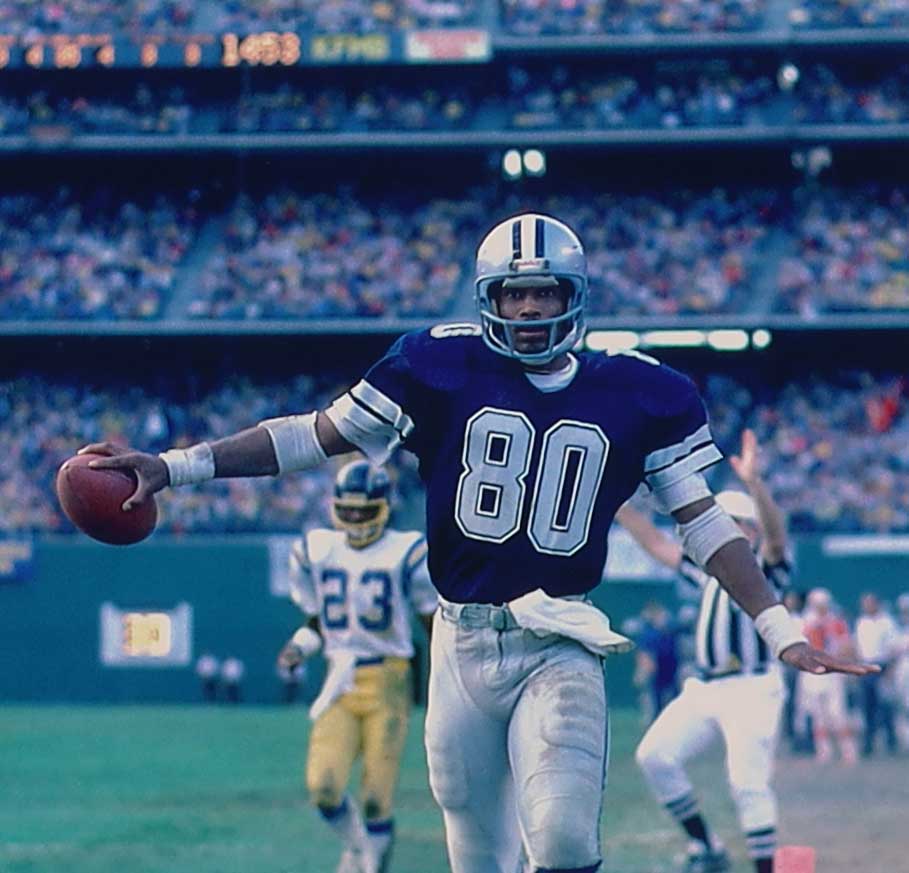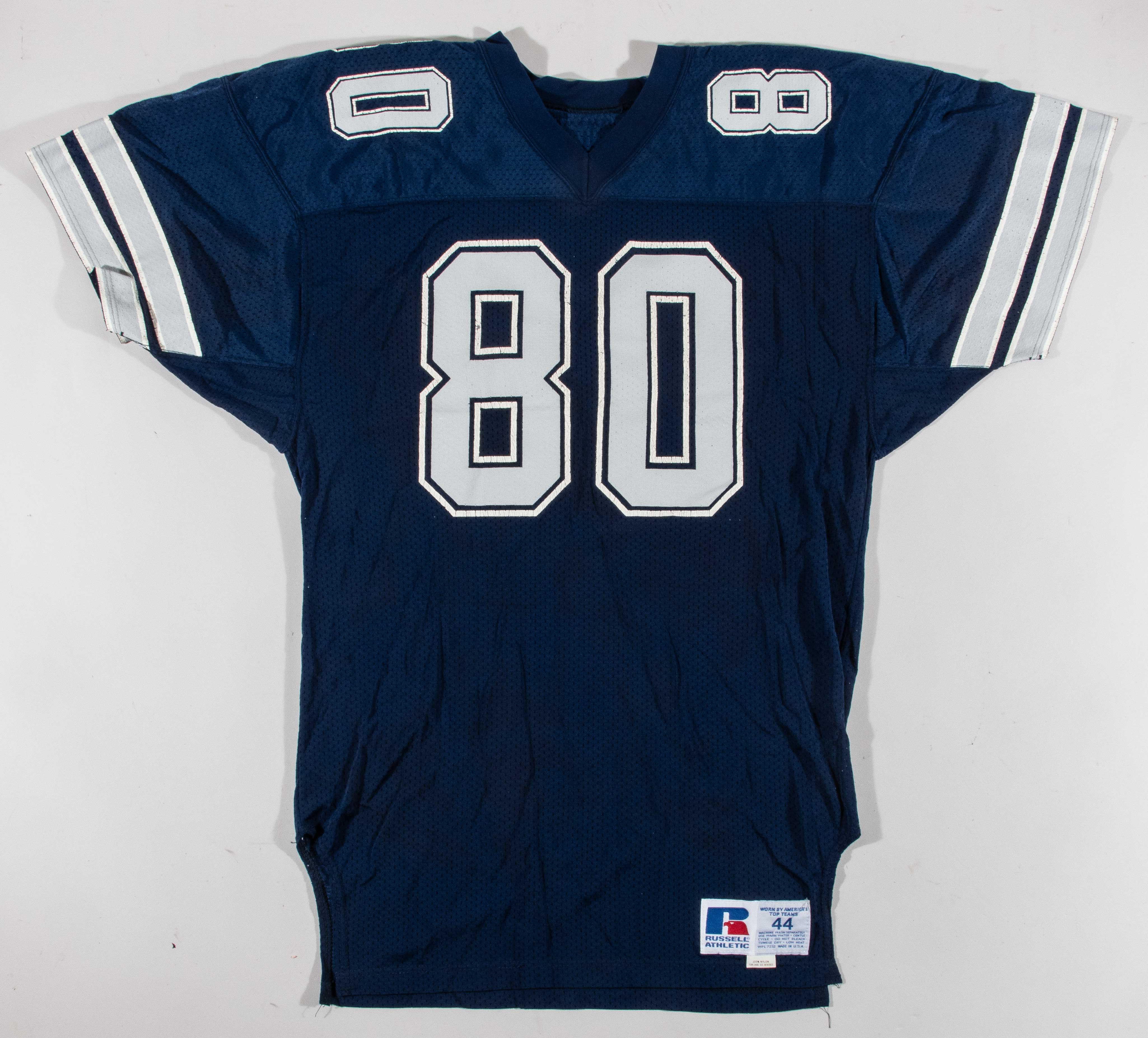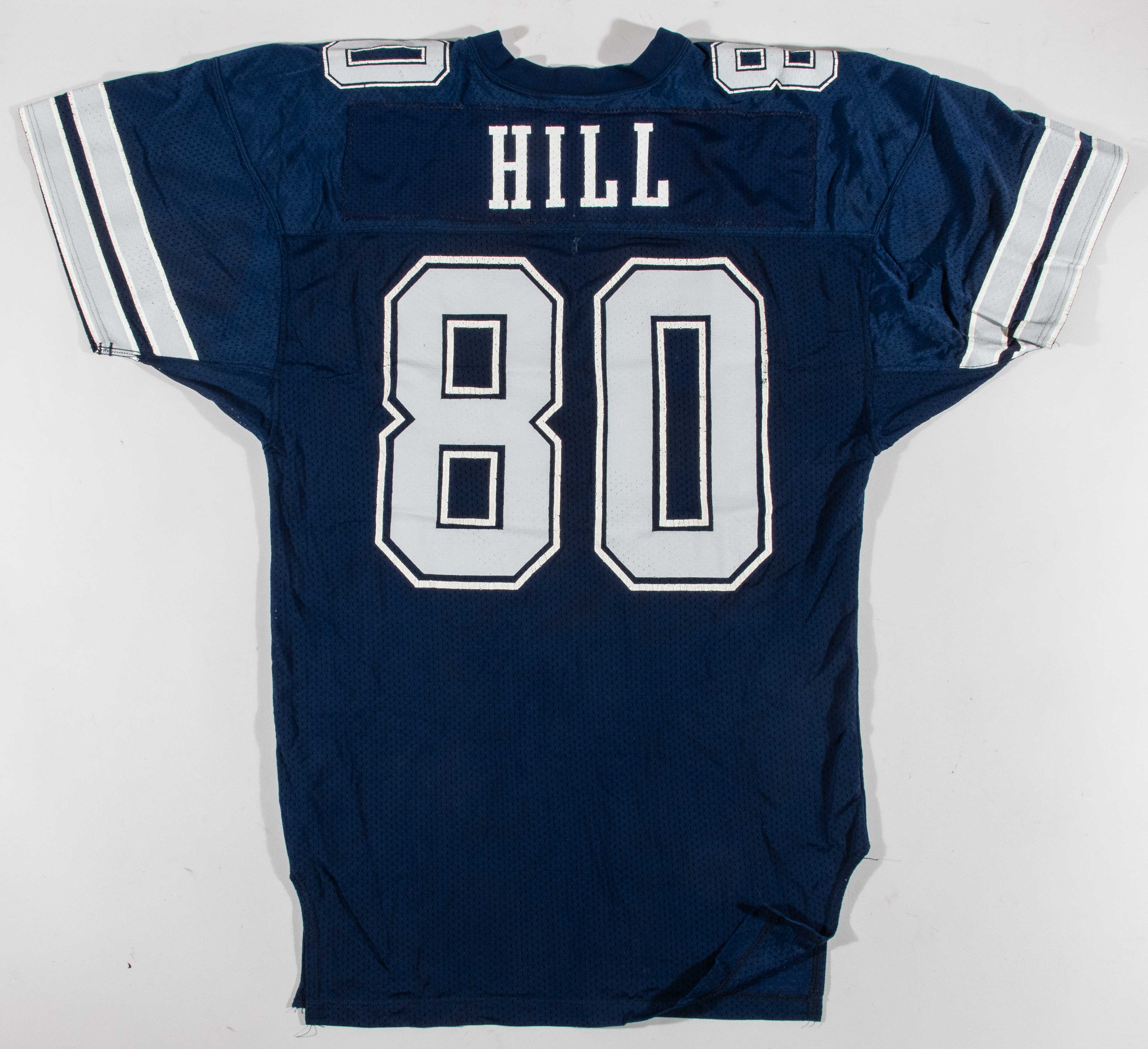 Description:Tony Hill professional model Dallas Cowboys jersey c.1985-86. Russell Athletic size 44 blue road jersey with "HILL" nameplate sewn across the back, along with #80 on the front, back, and shoulders. Russell Athletic tag is sewn on the front tail, with attached flag tag identifying material and wash care. Areas of cracking around the white number trim, and very supple fabric. Includes LOA from Hunt Auctions: EX