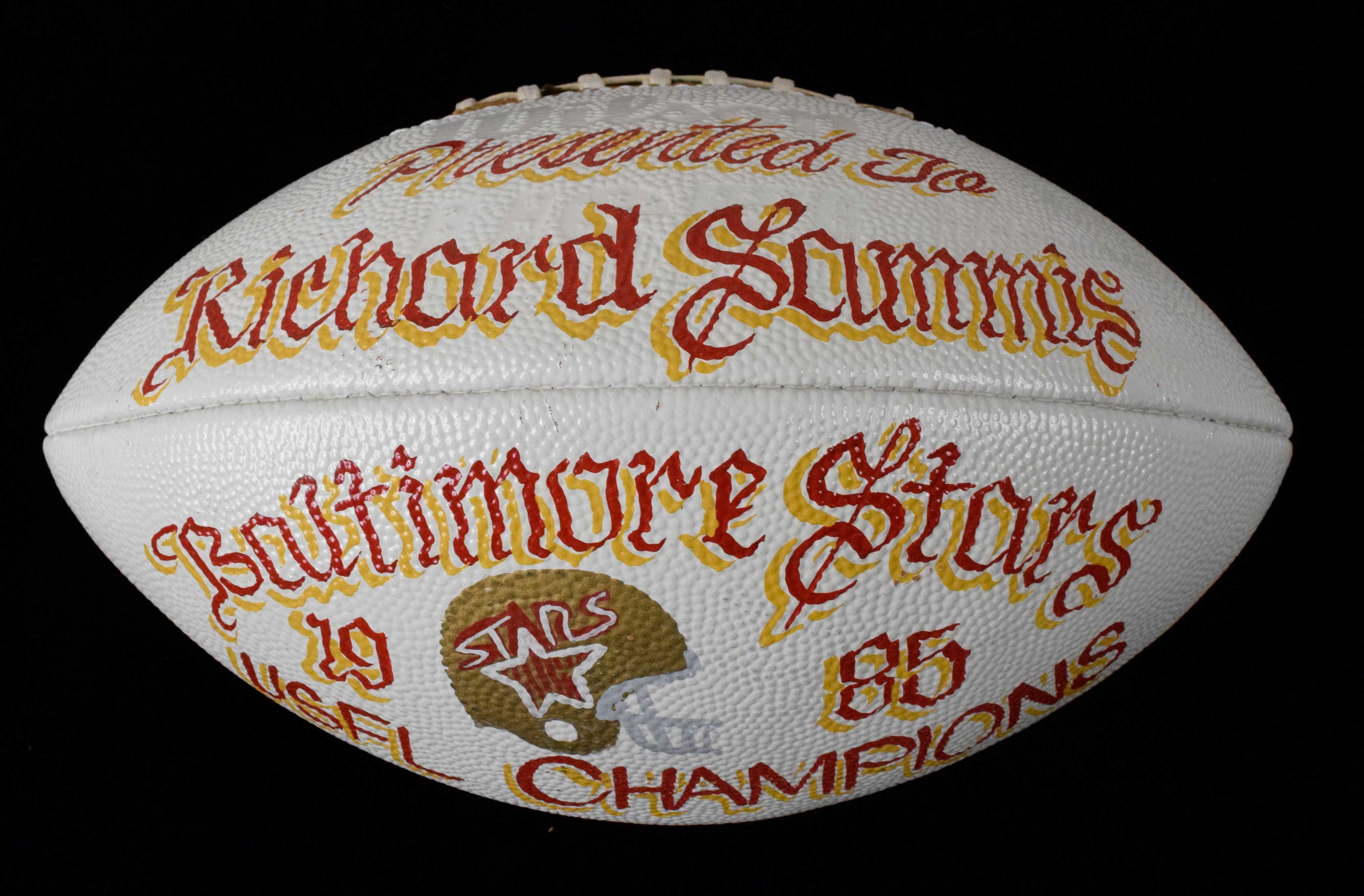 1985 Baltimore Stars USFL Champions game ball. Wilson official USFL ball painted "Presented To Richard Sammis" "Baltimore Stars 1985 USFL Champions" (Sammis was a Baltimore car dealer and investor): EX/MT