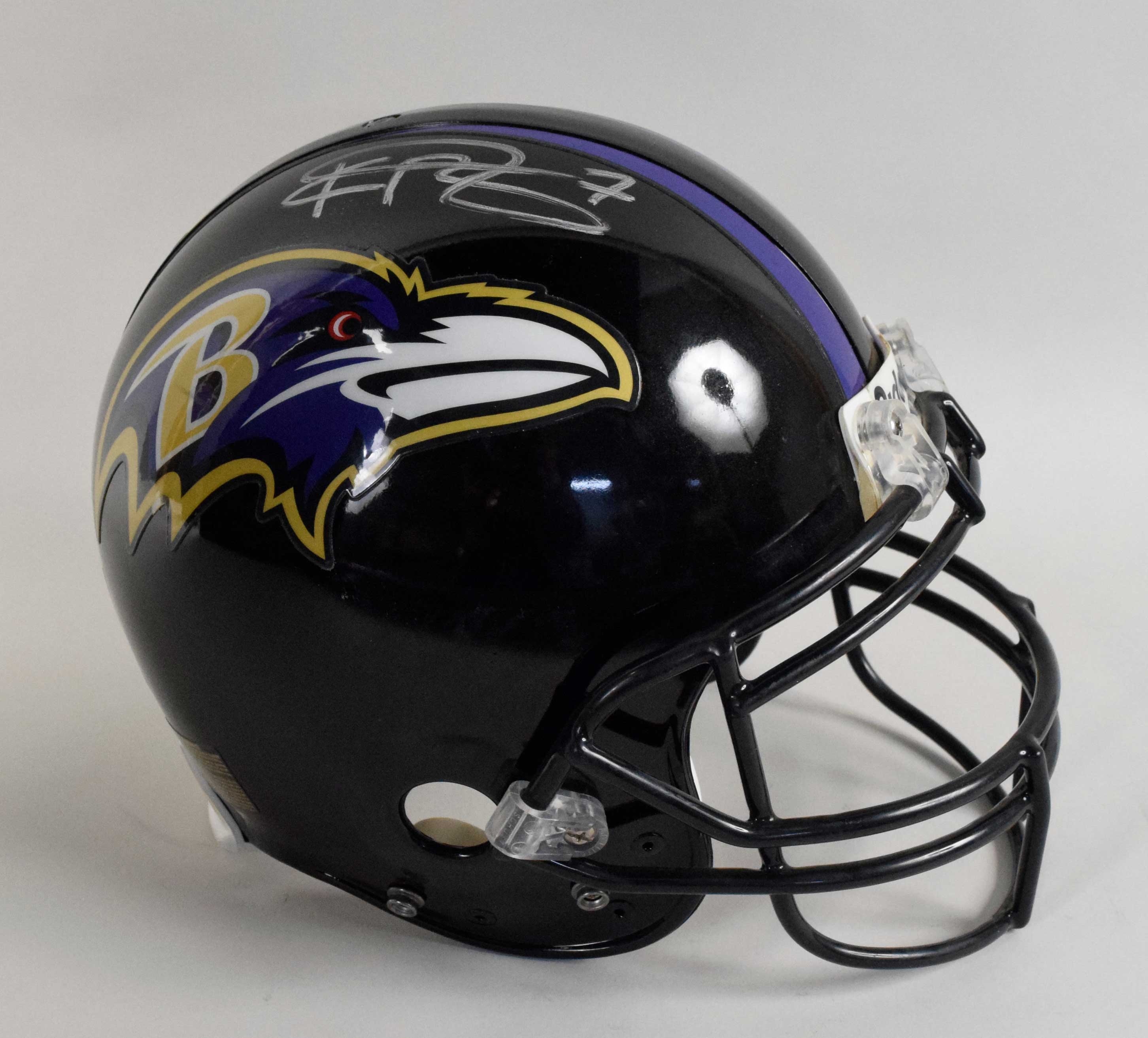 Description:Kyle Boller autographed Baltimore Ravens professional model helmet c.mid 2000s. Riddell VSR-4 Ravens helmet with American flag and #7 decals on the back, and Riddell 03-04 sticker inside. Boller signed the helmet in silver marker. Signature rates 7/8 out of 10. Appears only lightly worn, if at all. Includes LOA from Hunt Auctions (helmet) and COA from PSA/DNA (autograph) with matching serial #ed sticker on the helmet: EX/MT-NM