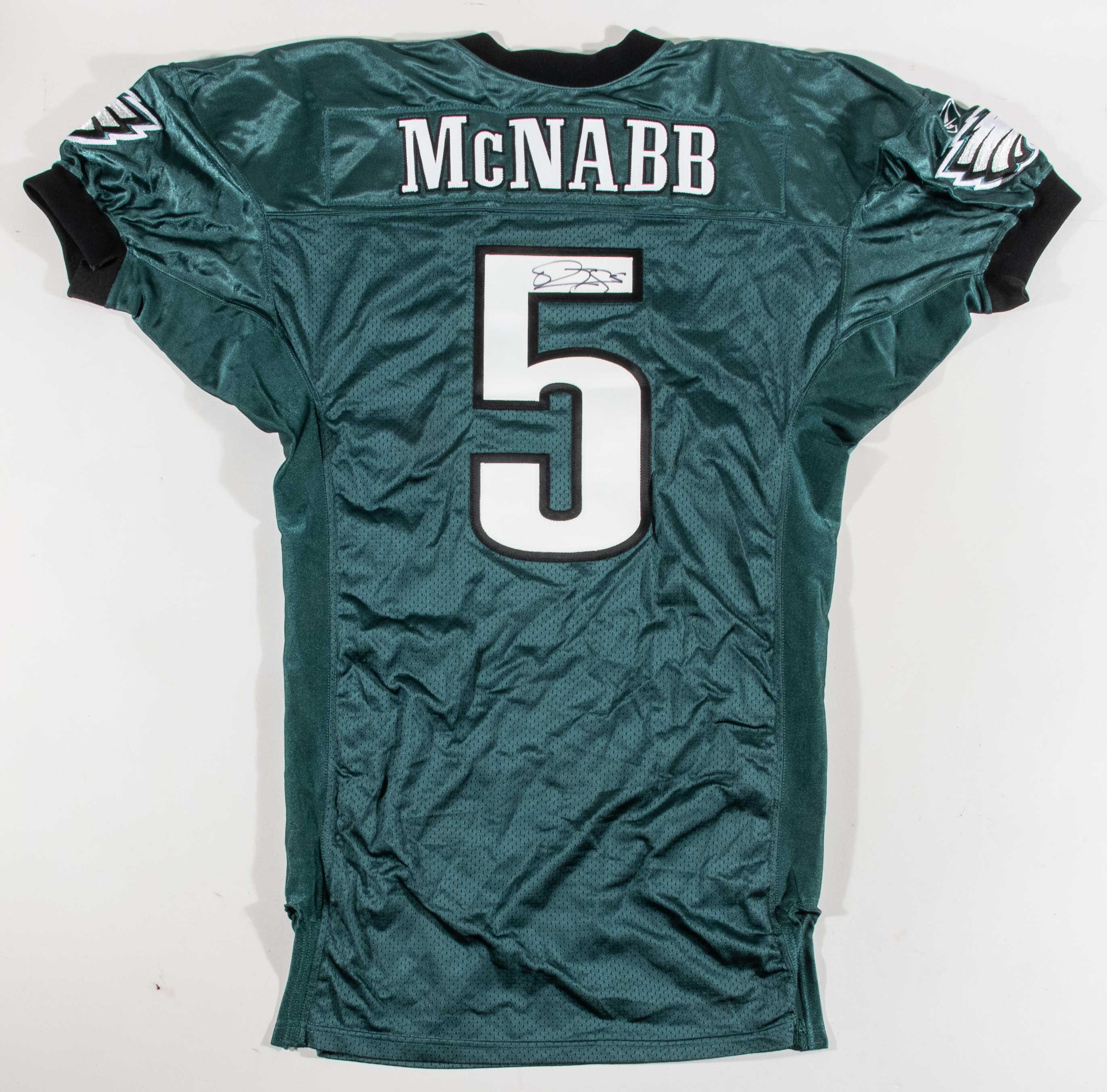 Description:Donovan McNabb autographed 2002 Philadelphia Eagles professional model jersey. Reebok NFL Equipment size 52 midnight green jersey with "McNABB" nameplate sewn across the back, along with #5 sewn on the front, back, and shoulders. "02-52" year/size tag is sewn inside the collar, NFL patch is sewn on the front collar above "EAGLES" patch, and Reebok tagging is on the front tail with 4" L.B. and 52 flag tags attached. McNabb signed the jersey in black marker. Signature rates 8 out of 10. Appears only lightly worn, if at all. Includes LOA from Hunt Auctions (jersey) and JSA auction LOA (autograph): EX/MT