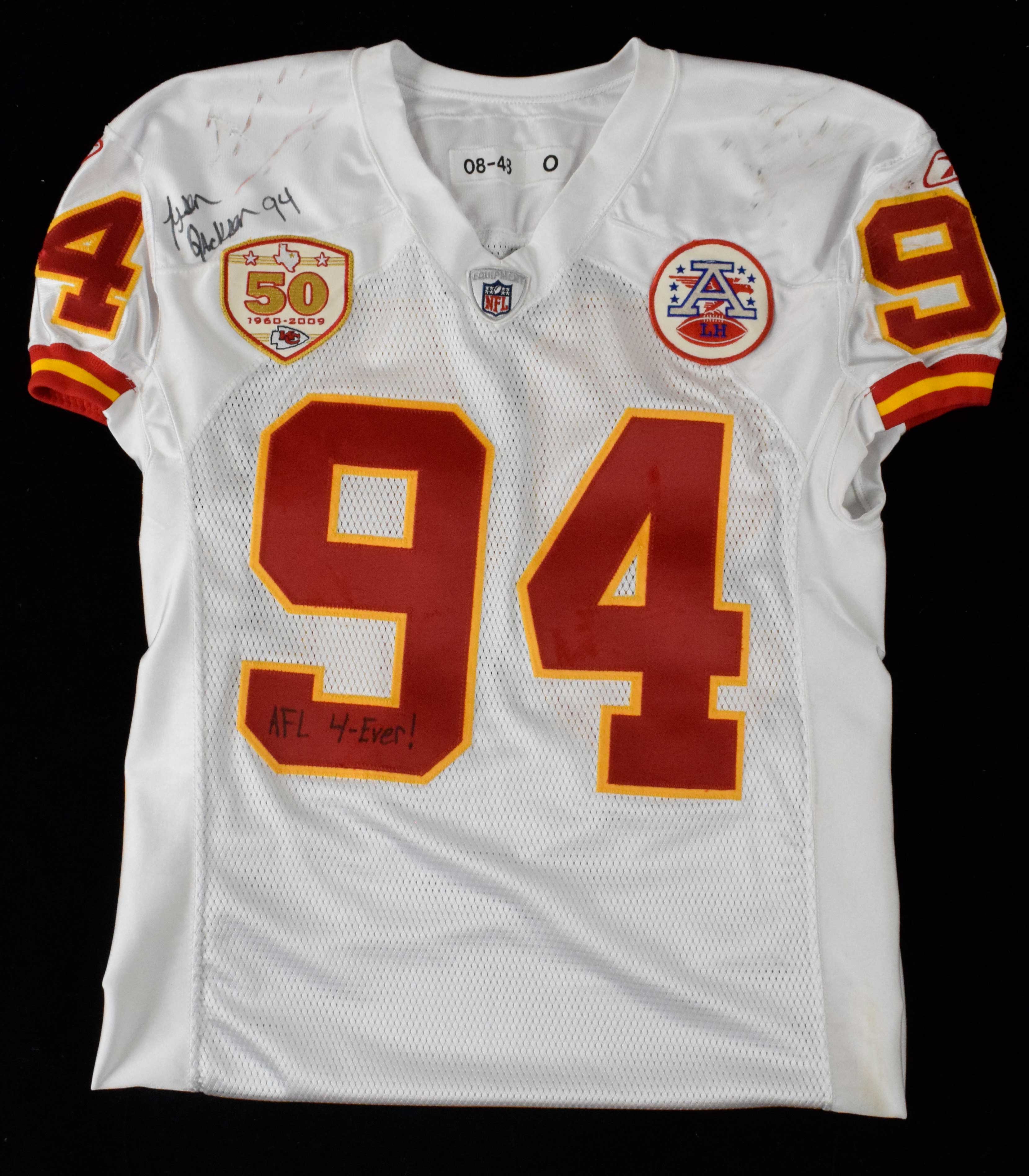 Description:Tyson Jackson autographed 2009 Kansas City Chiefs professional model jersey. Reebok NFL Equipment size 48 white jersey with "JACKSON" nameplate sewn across the back, along with #94 sewn on the front, back, and sleeves. AFL "LH" Lamar Hunt memorial patch is sewn on the front left, and Chiefs 50th Season patch is sewn on the front right of the jersey. Reebok tagging is on the front tail with 6" LB and size 48 flag tags attached. "08-48" "O" strip tag is sewn inside the collar indicating a 2008 shell jersey was used to create this jersey for Jackson's 2009 rookie year. Jackson signed the jersey in black marker and added "AFL 4-Ever!" inscription. Signature rates 8/9 out of 10. Impressive use with wear on the numbers and heavy stains on the back and shoulders. Includes LOAs from Hunt Auctions (jersey) and Beckett (autograph): EX