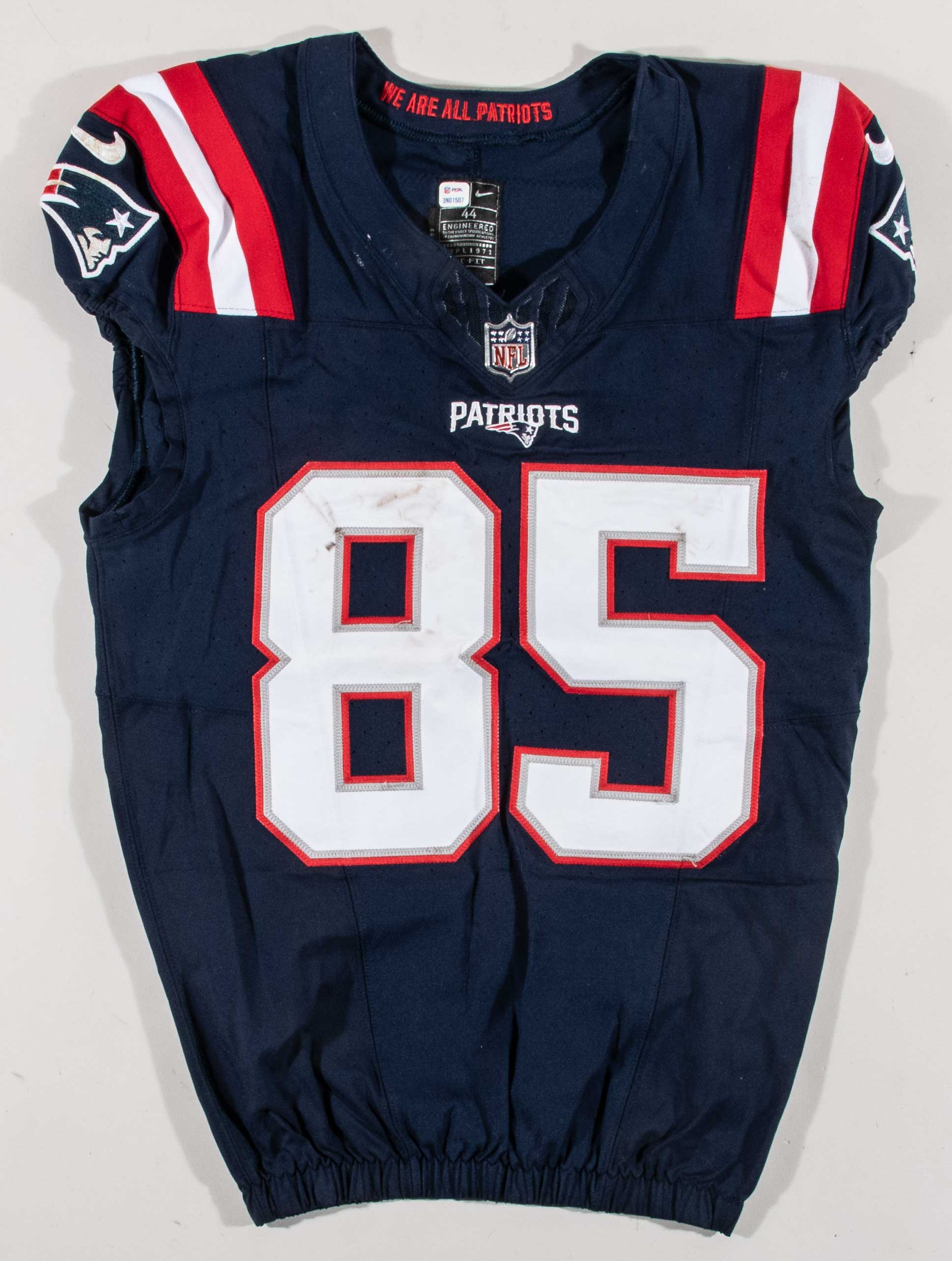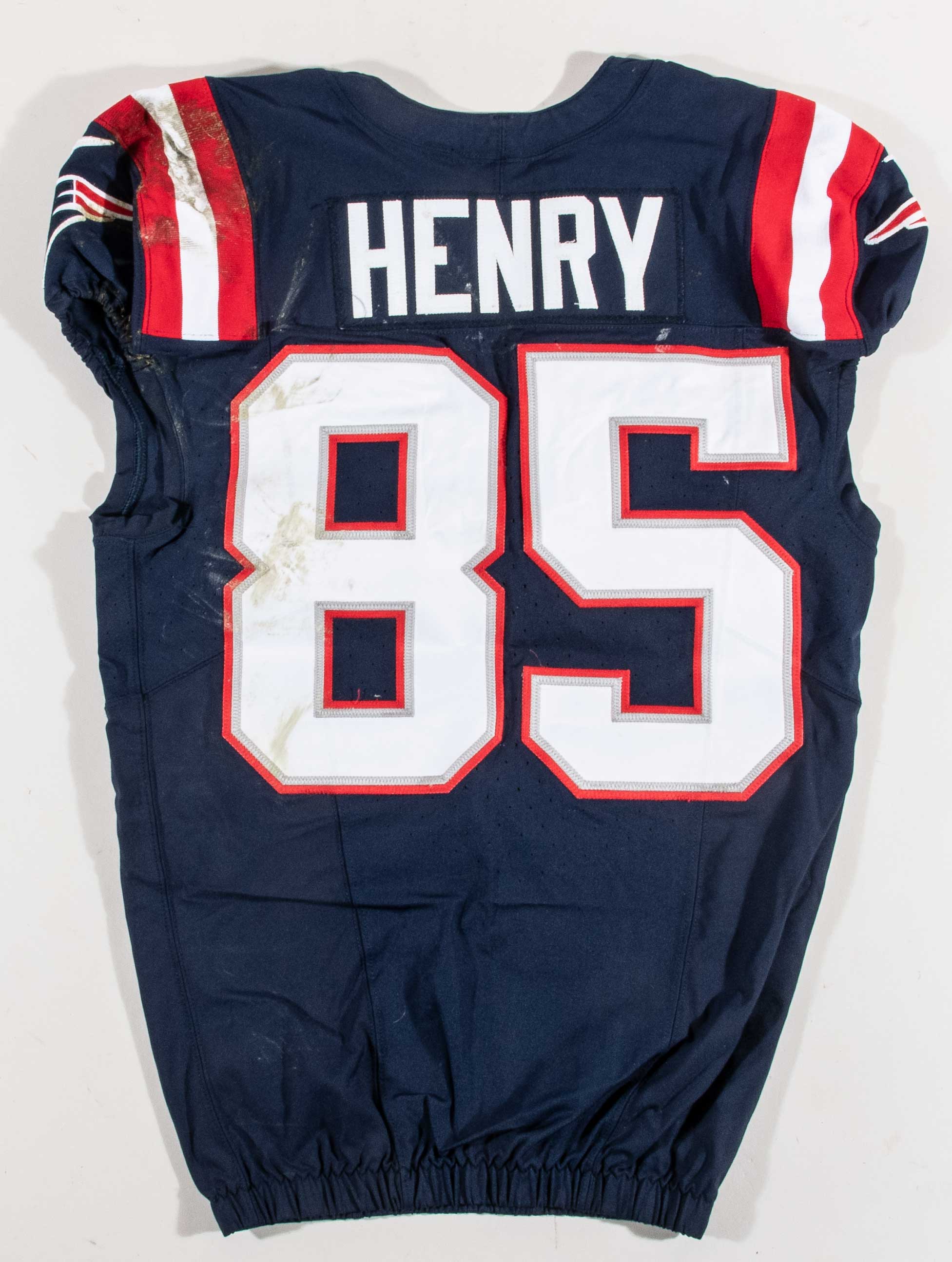 Description:11/12/2023 Hunter Henry game worn New England Patriots jersey (PSA/NFL Auctions). Nike "On Field" size 44 Patriots #85 Hunter Henry jersey worn during their International Series game in Germany against the Colts. Henry had 3-catches for 21-yards in the game. Excellent use with impact marks on the front, and heavy field stains on the back. Includes NFL Auction COA from PSA, with matching serial #3N01507 sticker on the jersey, along with a printed color copy of a photo picturing Henry wearing the jersey: EX