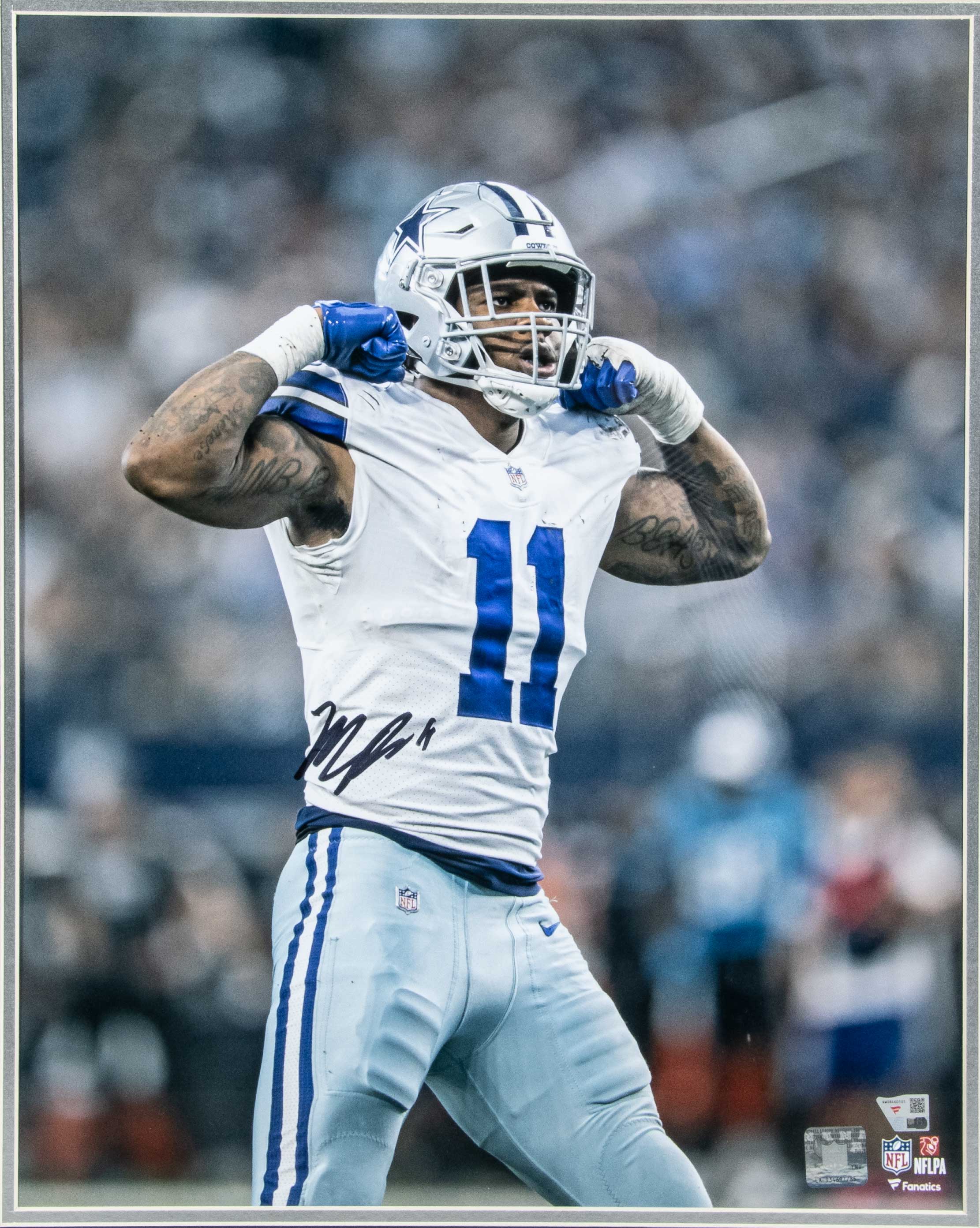 Micah Parsons autographed 16"x20" framed photograph. Color photo has been signed in marker rating 9/10 out of 10 and framed to 22.5"x26.5" for display. Fanatics authentication hologram affixed: NM
