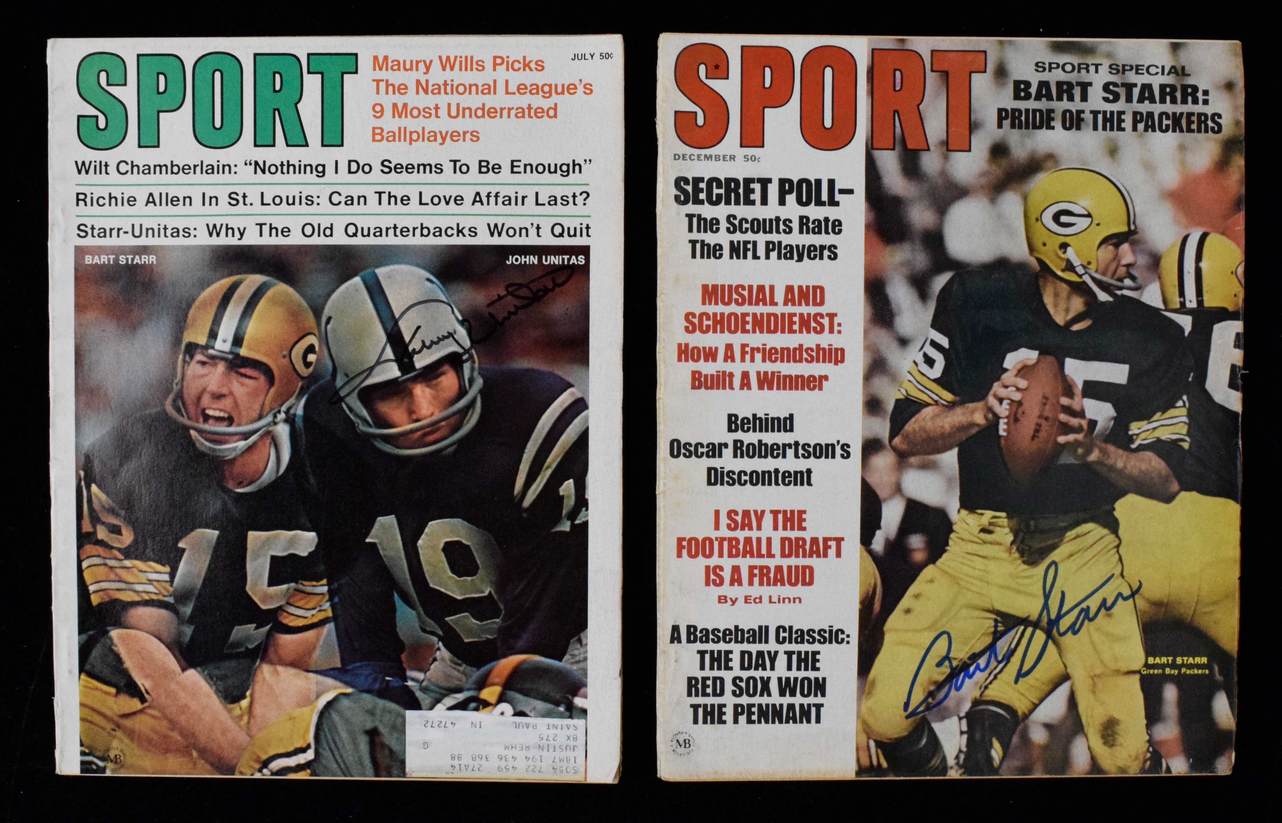 Description:Bart Starr and Johnny Unitas autographed Sports Magazines. Vintage issues of Sport Magazine including pieces signed by Unitas (1970 cover date, mailing label) and Starr (1967). Marker signatures rate 8 to 9 out of 10. Mild scattered handling and age related wear is more pronounced on Starr. Includes auction LOA from JSA: Sigs. NM, Magazines VG and EX