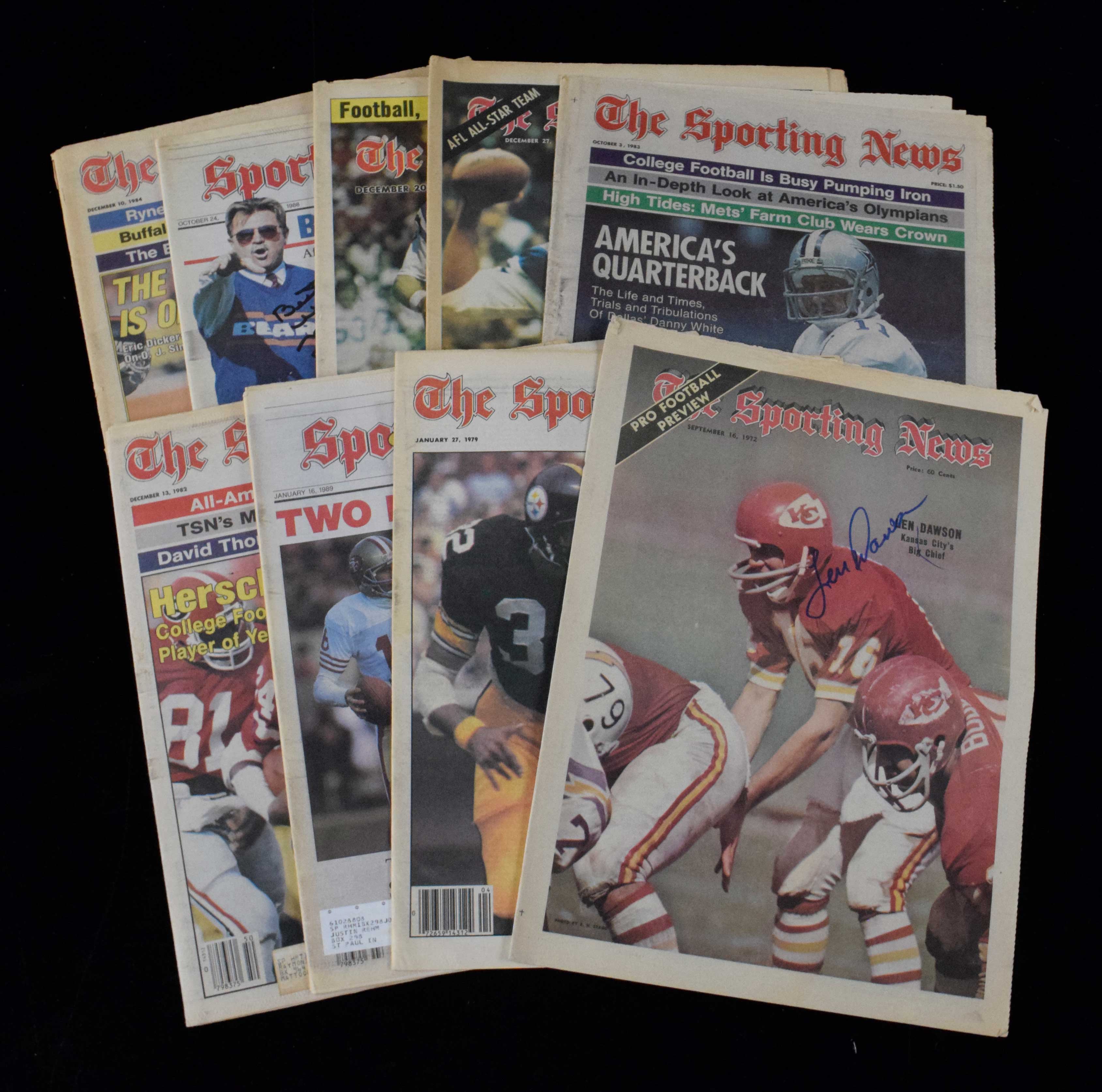 Description:Lot of (10) Football Hall of Famer autographed Sporting News covers and/or issues. Sporting News covers (in some cases complete issues, others partial, and a few are simply covers) signed by Jim Plunkett, Mike Ditka, Eric Dickerson, Roman Gabriel, Bert Jones, Roman Gabriel, Danny White, Herschel Walker, Boomer Esiason, Franco Harris, and Len Dawson. Marker signatures rate 8 out of 10 or better. Varying degrees of light to mild handling wear and many have mailing labels. Includes auction LOA from JSA: Sigs. NM, Covers VG-EX