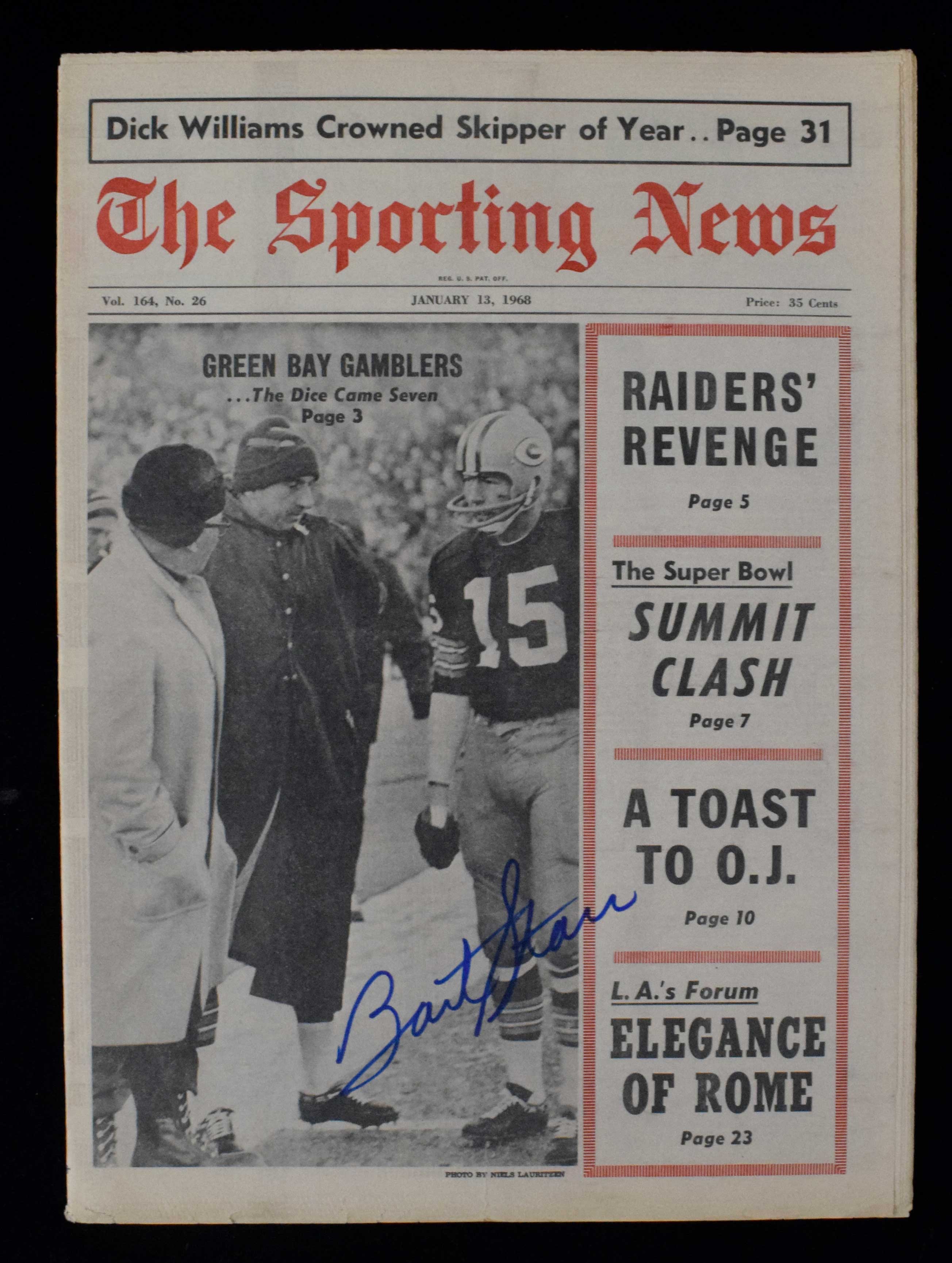 Bart Starr autographed 1968 Sporting News. Signed in marker rating 9 out of 10. Touch of light natural toning and storage/handling wear. Includes auction LOA from JSA: Sig. NM
