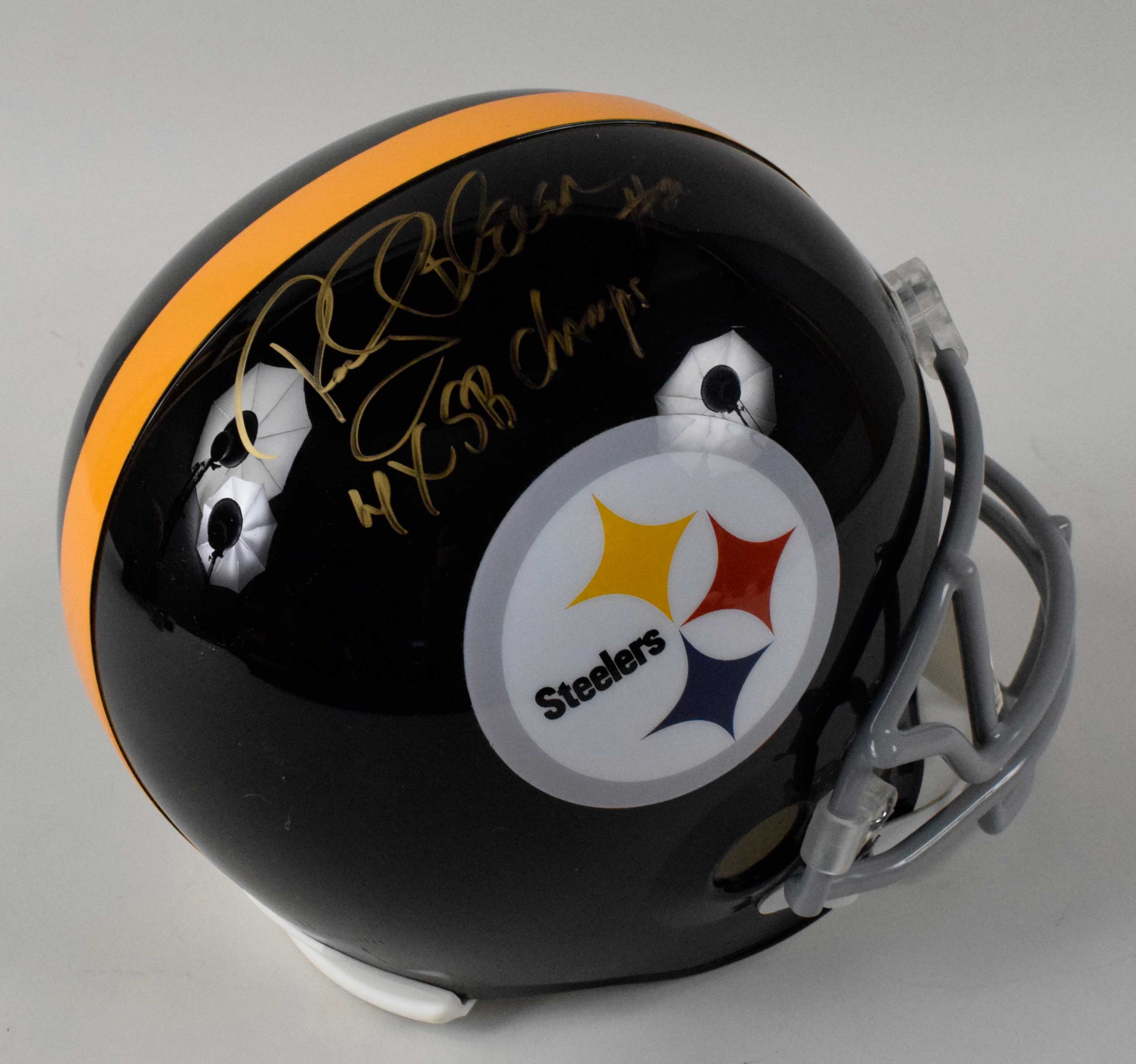 Description:Rocky Bleier autographed and inscribed Pittsburgh Steelers helmet. Full size replica helmet by Riddell has been signed in gold marker (7/8-8 out of 10) and inscribed "4X SB Champs." Includes auction LOA from JSA and there is a Schwartz Sports hologram affixed: NM