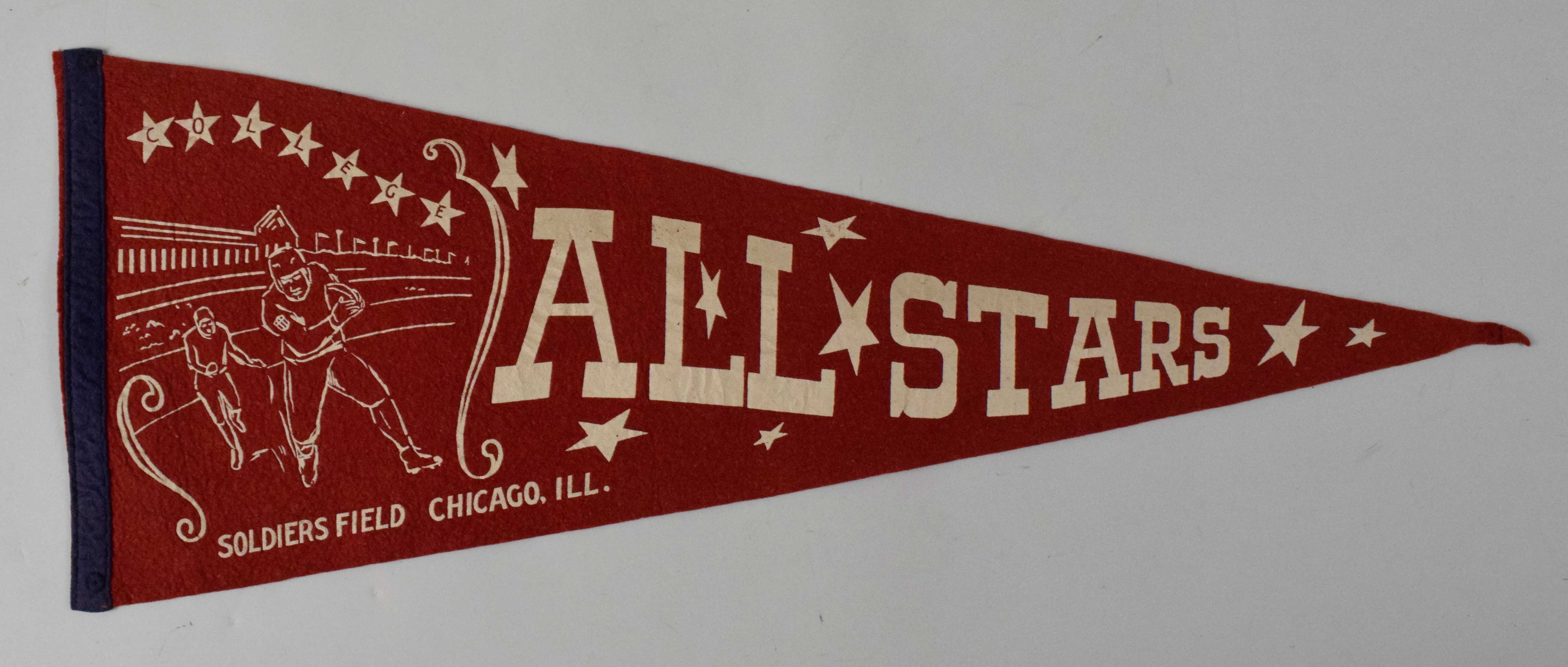 College Football All-Stars pennant c.1940-50s. 28" red pennant with white lettering and detailed football game scene at left side. Light wear: EX