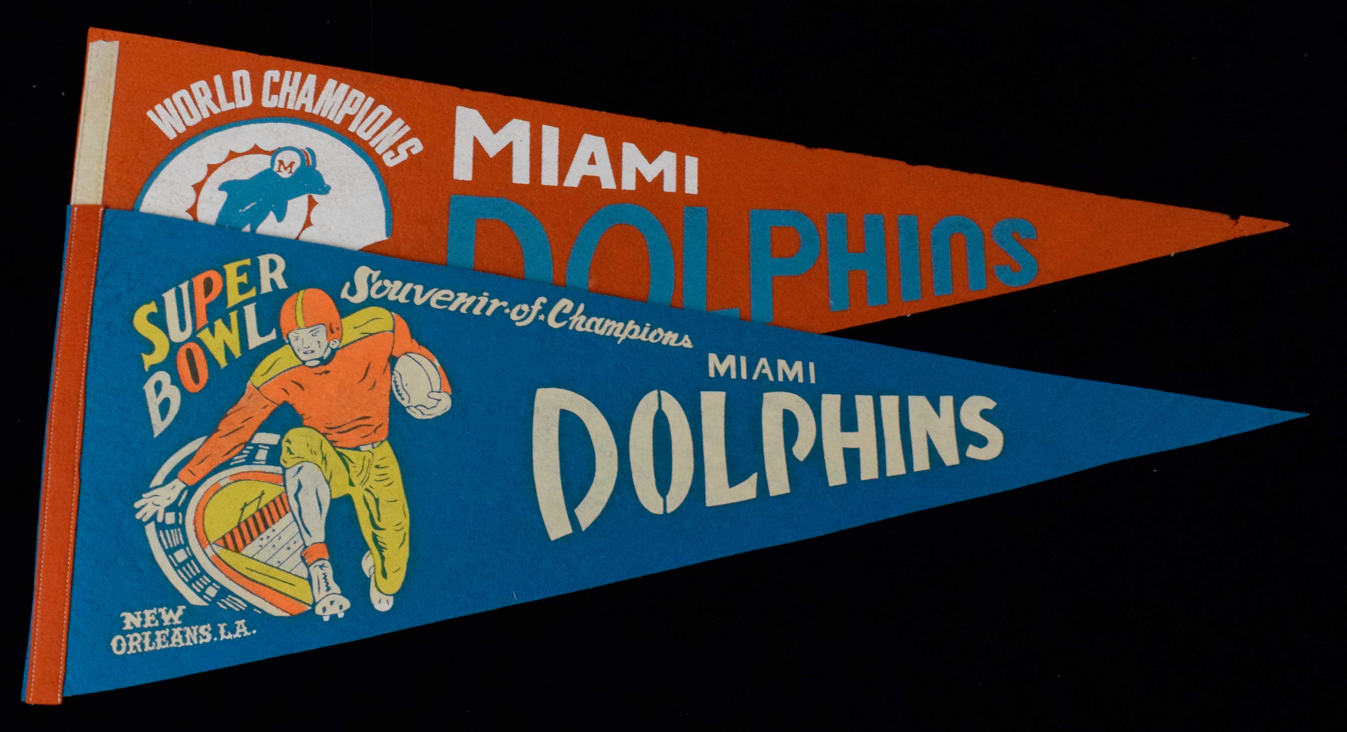 Lot of (2) Miami Dolphins vintage championship pennants. Includes 29.5" 1/16/1972 Super Bowl VI pennant (EX/MT-NM), and 29.5" 1972 World Champions pennant (VG).