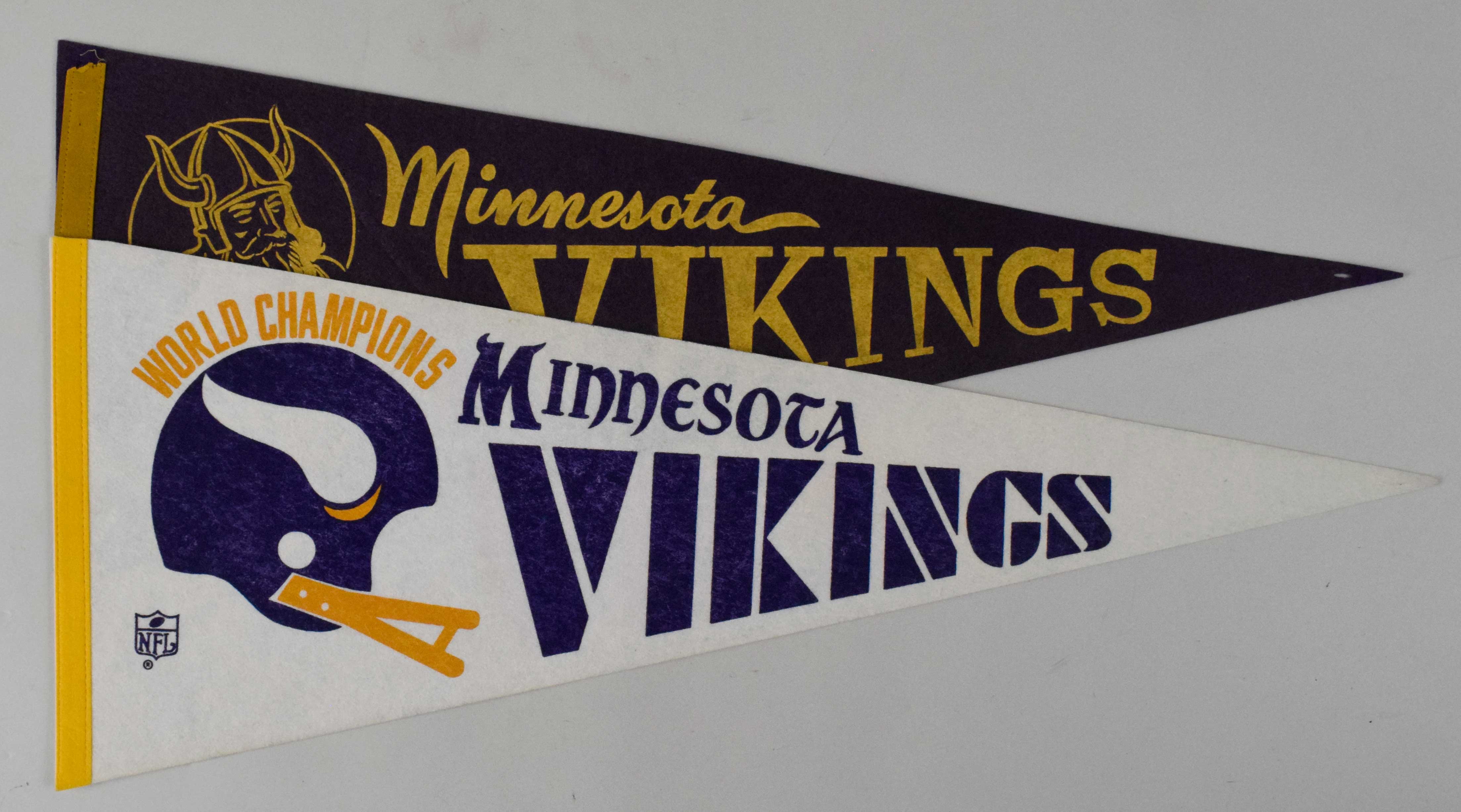 Lot of (2) Minnesota Vikings vintage championship pennants. Includes c.1968-69 29.5" pennant with "CHAMPIONS" text across the viking ship (VG), and c.1970s 30" World Champions phantom pennant (EX/MT-NM).