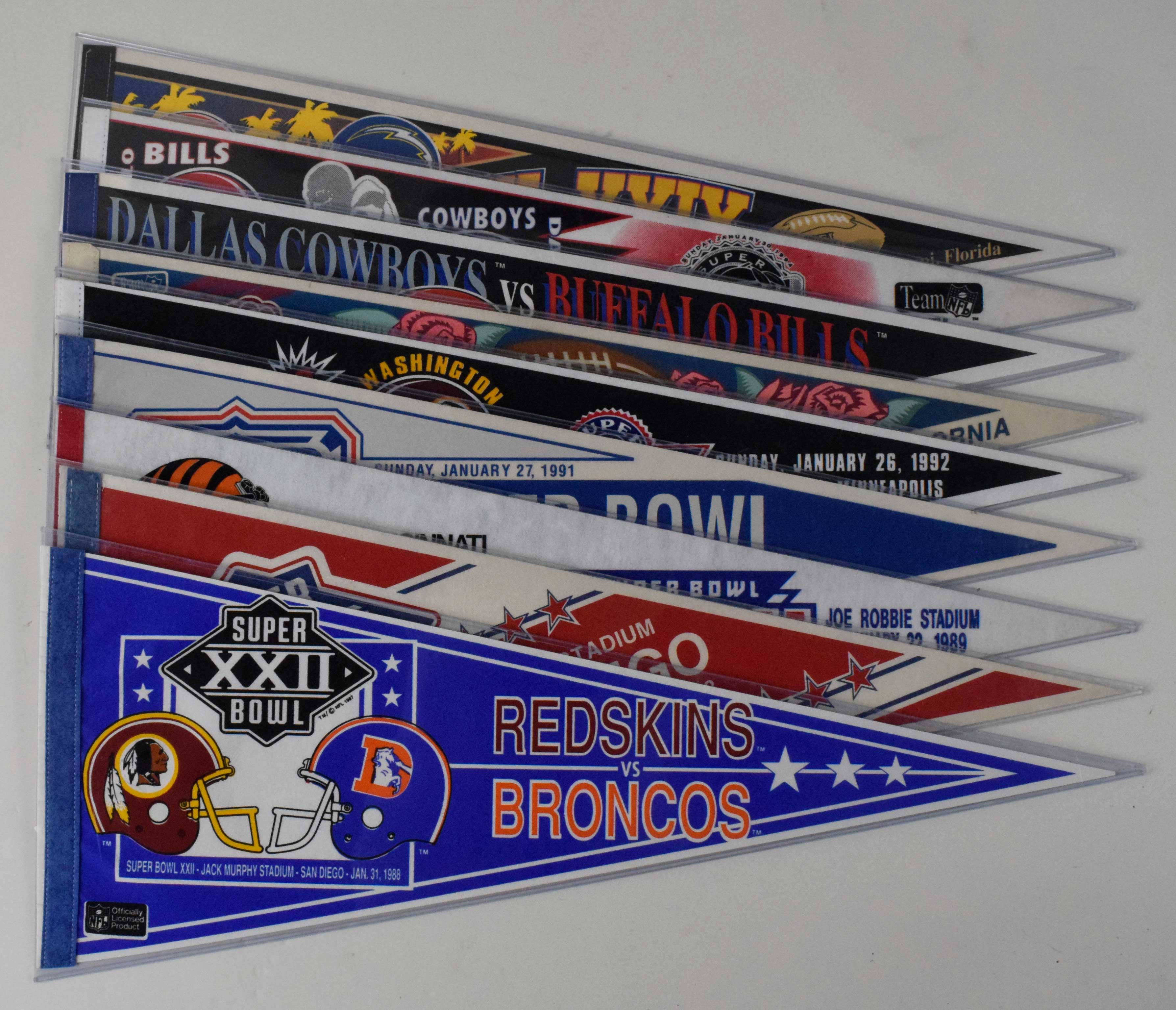 Description:Lot of (26) Super Bowl pennants from 1988-2008. All are full size Super Bowl matchup or logo pennants ranging from Super Bowl XXII through XLII. Minimal duplication, although there are multiple designs from various years. Most appear to average NM overall. Range: VG-NM/MT