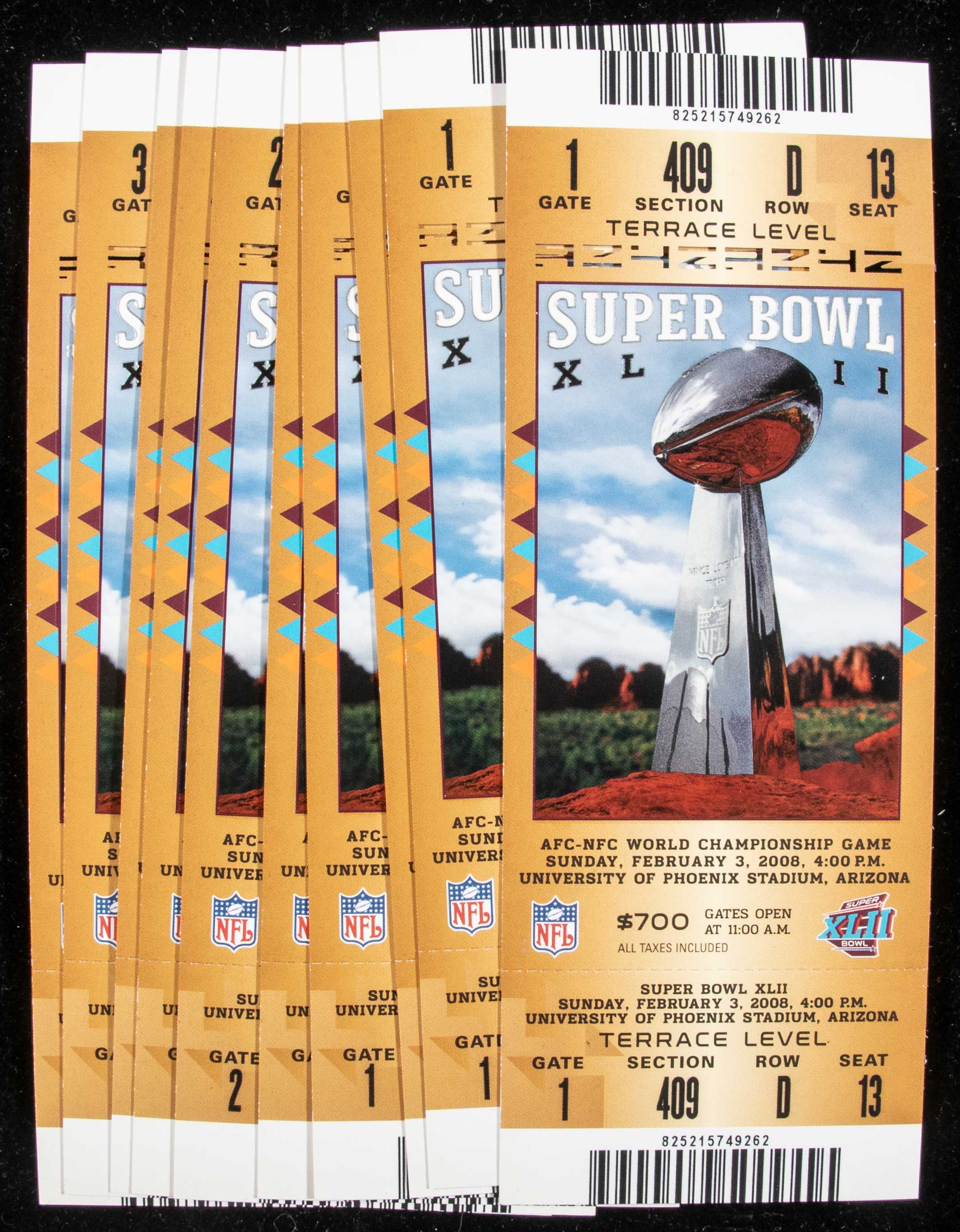 Description:Lot of (10) Super Bowl XLII full tickets. Includes (10) 2/3/2008 full tickets for Super Bowl XLII in which the New York Giants defeated the New England Patriots by a score of 17-13. Most appear to average EX/MT-NM overall. Range: EX-NM/MT