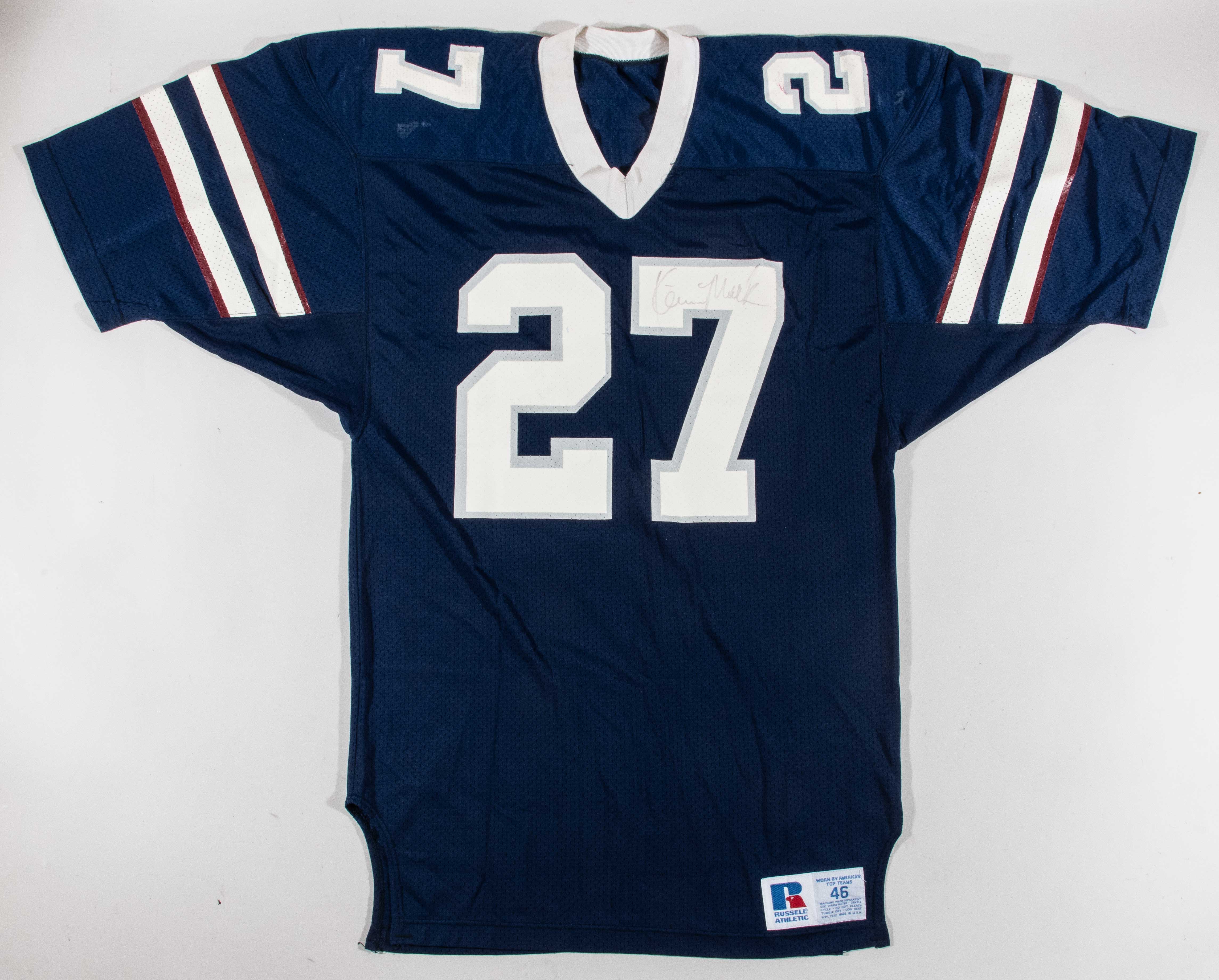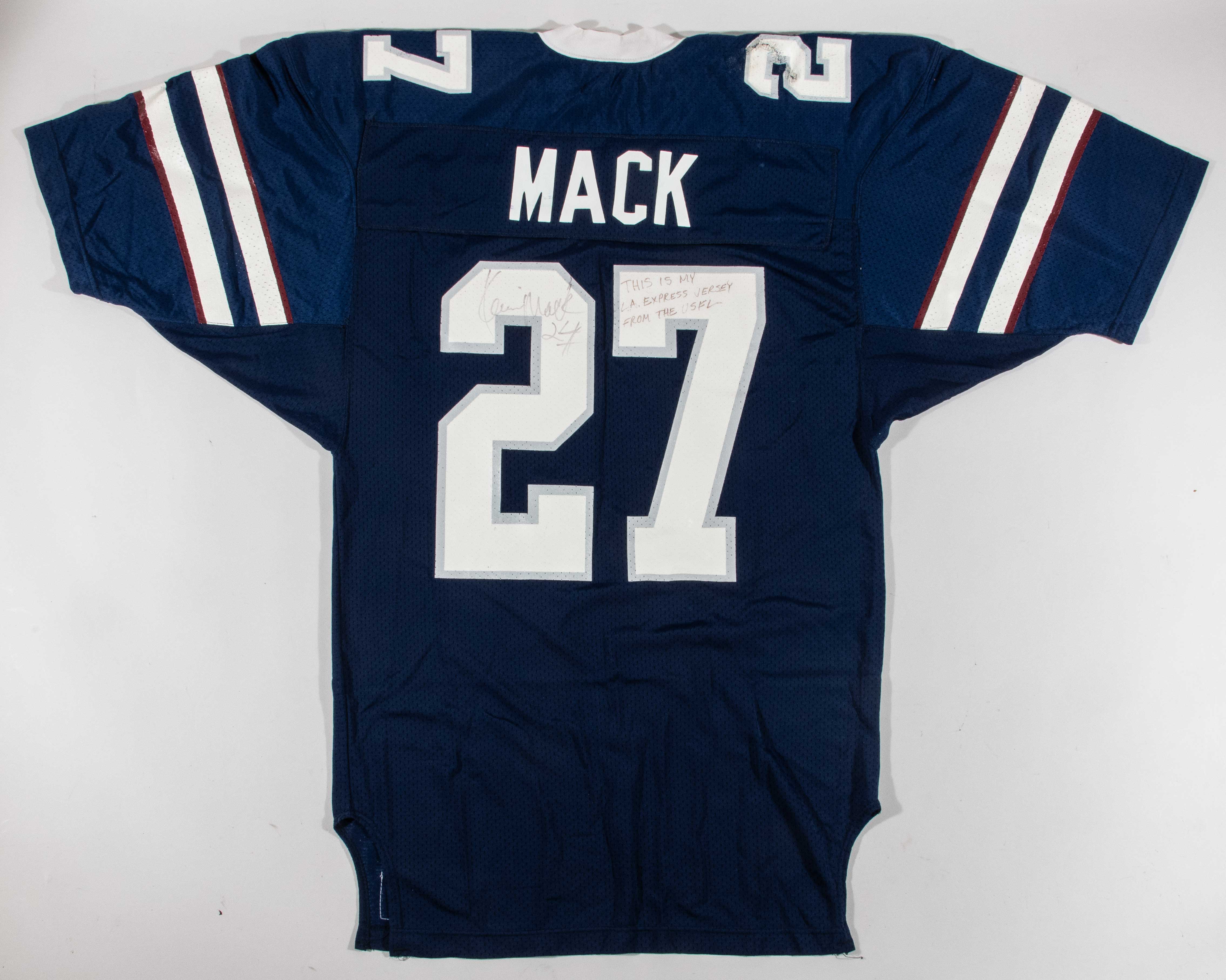 Description:Kevin Mack twice-signed & inscribed 1984 Los Angeles Express professional model USFL jersey (Team repair). Russell Athletic size 46 LA Express #27 Kevin Mack jersey signed on both the front and back by Mack in black marker. Mack added "This Is My L.A. Express Jersey From The USFL" inscription on the back. Signatures rate 7 out of 10 due to some fading. Wonderful use with impact marks on the shoulders, and a large team repair on the right shoulder. Includes LOA from Hunt Auctions (jersey), and JSA auction LOA (autograph): EX