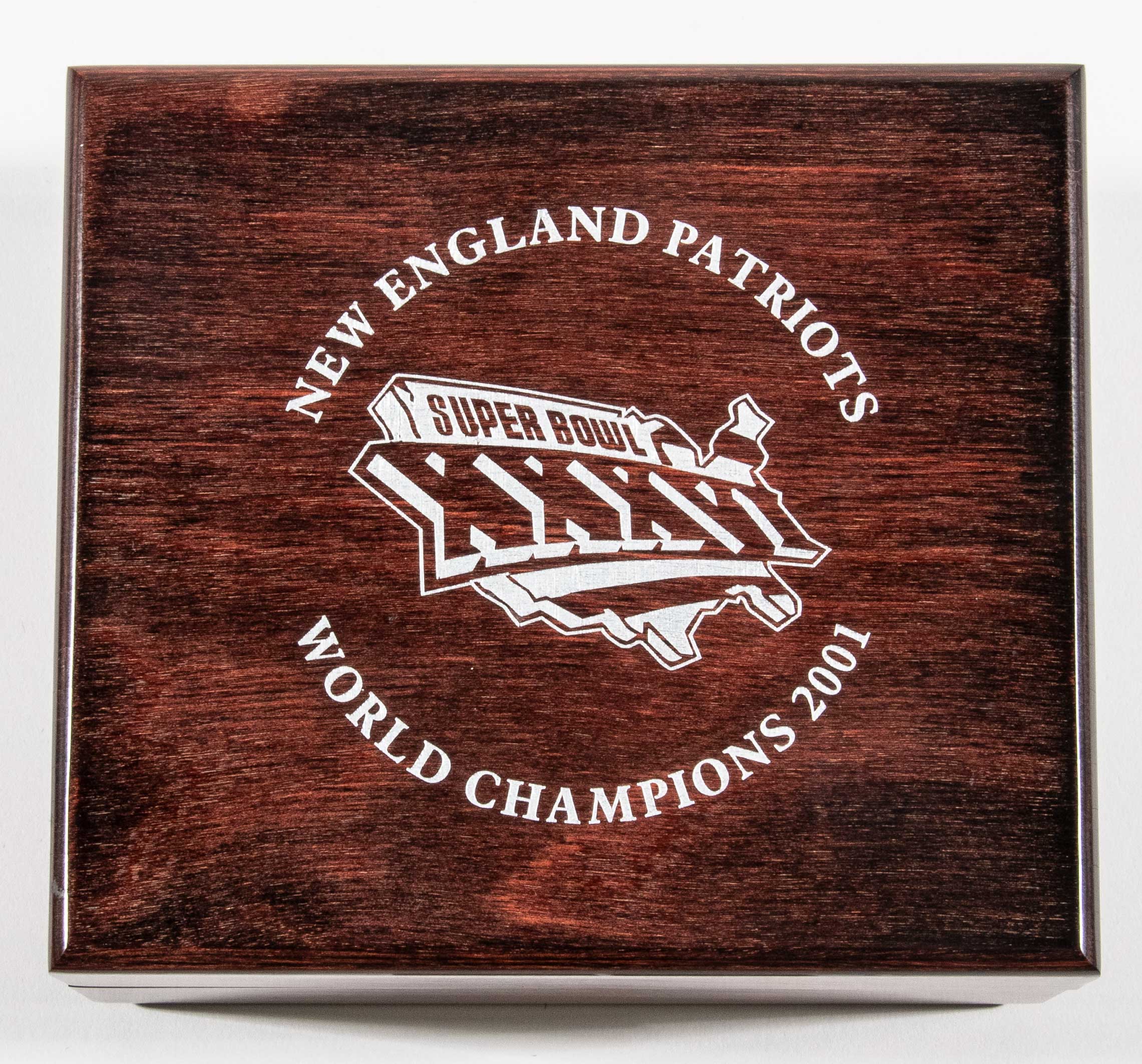 New England Patriots 2001 Super Bowl XXXVI Championship ring box. Original box from Jostens which once held a coveted Patriots championship ring issued following their first Super Bowl victory. Minimal wear: NM