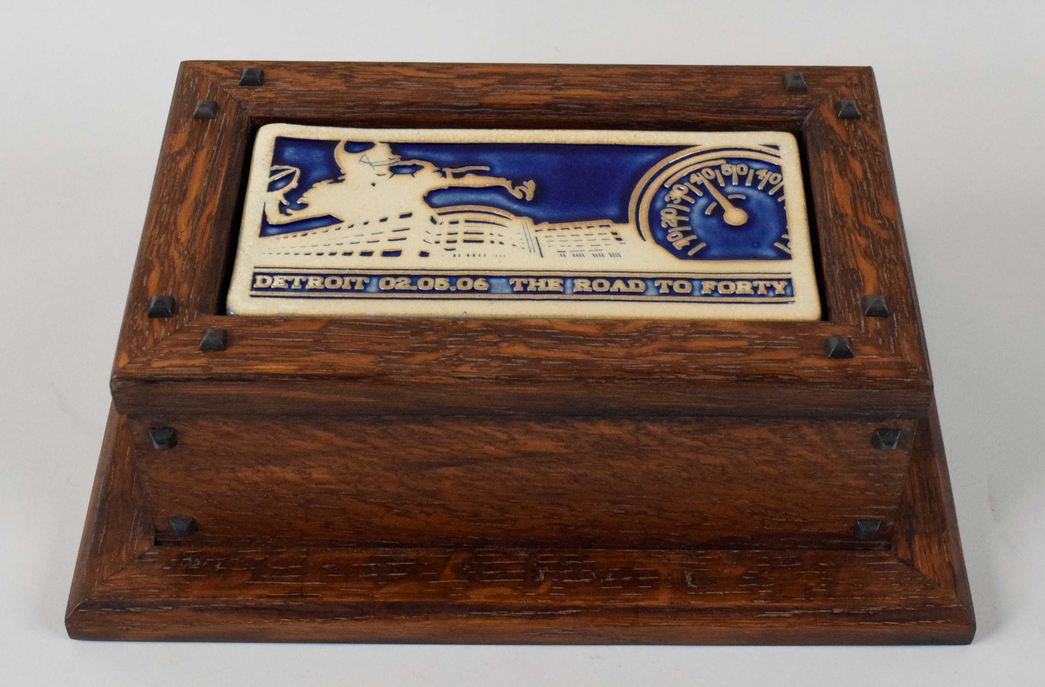 Description:2006 Super Bowl XL trinket box by Pewabic Pottery. Wooden base measures 8.5"x12.5" with a 4.5" trinket box on top. Tiled lid reads "Detroit 2.05.06 The Road To Forty" with a decorative stadium/football design above. Pewabic Pottery label is on the underside which notes Geneviene Sylvia as designer and Michael Majeske as designed & craftsman: NM