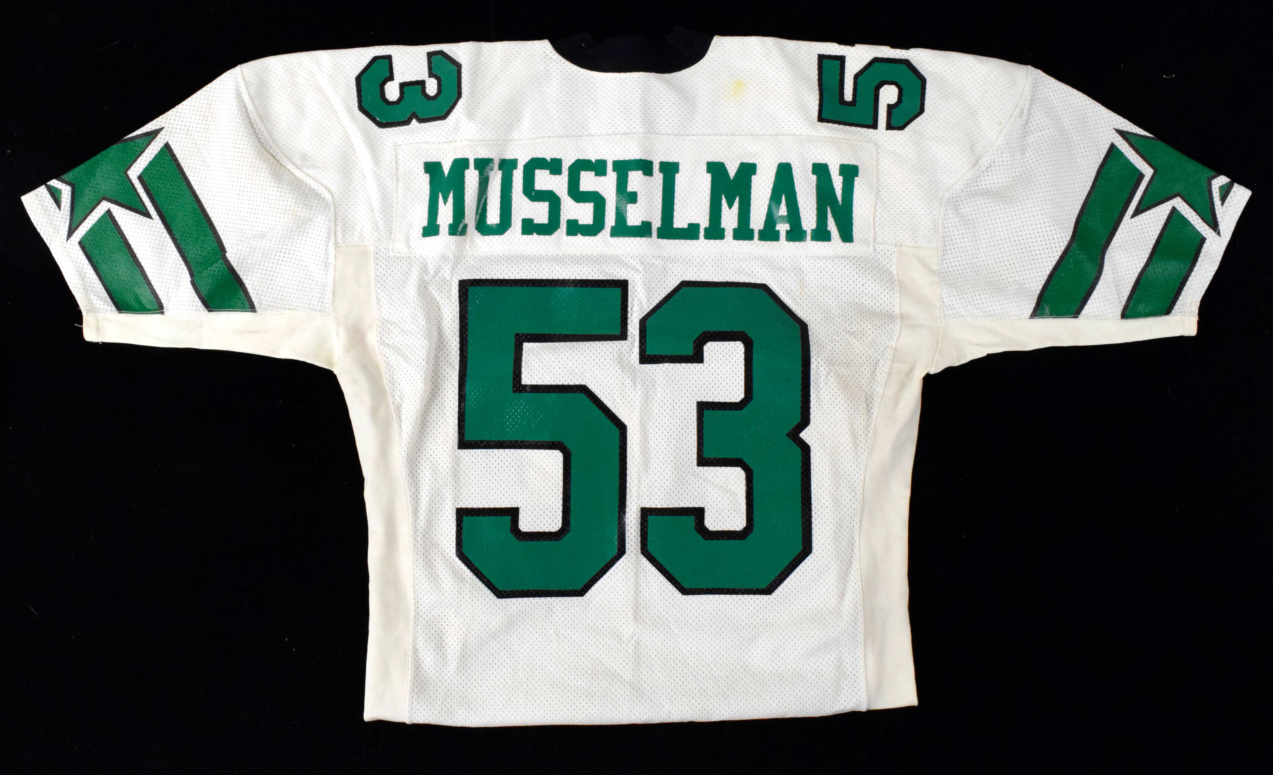 Description:1984 Brian Musselman professional model Washington Federals USFL jersey. Russell Athletic size 52 white road jersey with "MUSSELMAN" nameplate sewn across the back, #53 on the front, back, and shoulders, and Russell Athletic tag sewn on the front tail. Terrific use with stains and impact marks on the front and back. Includes LOA from Hunt Auctions: EX