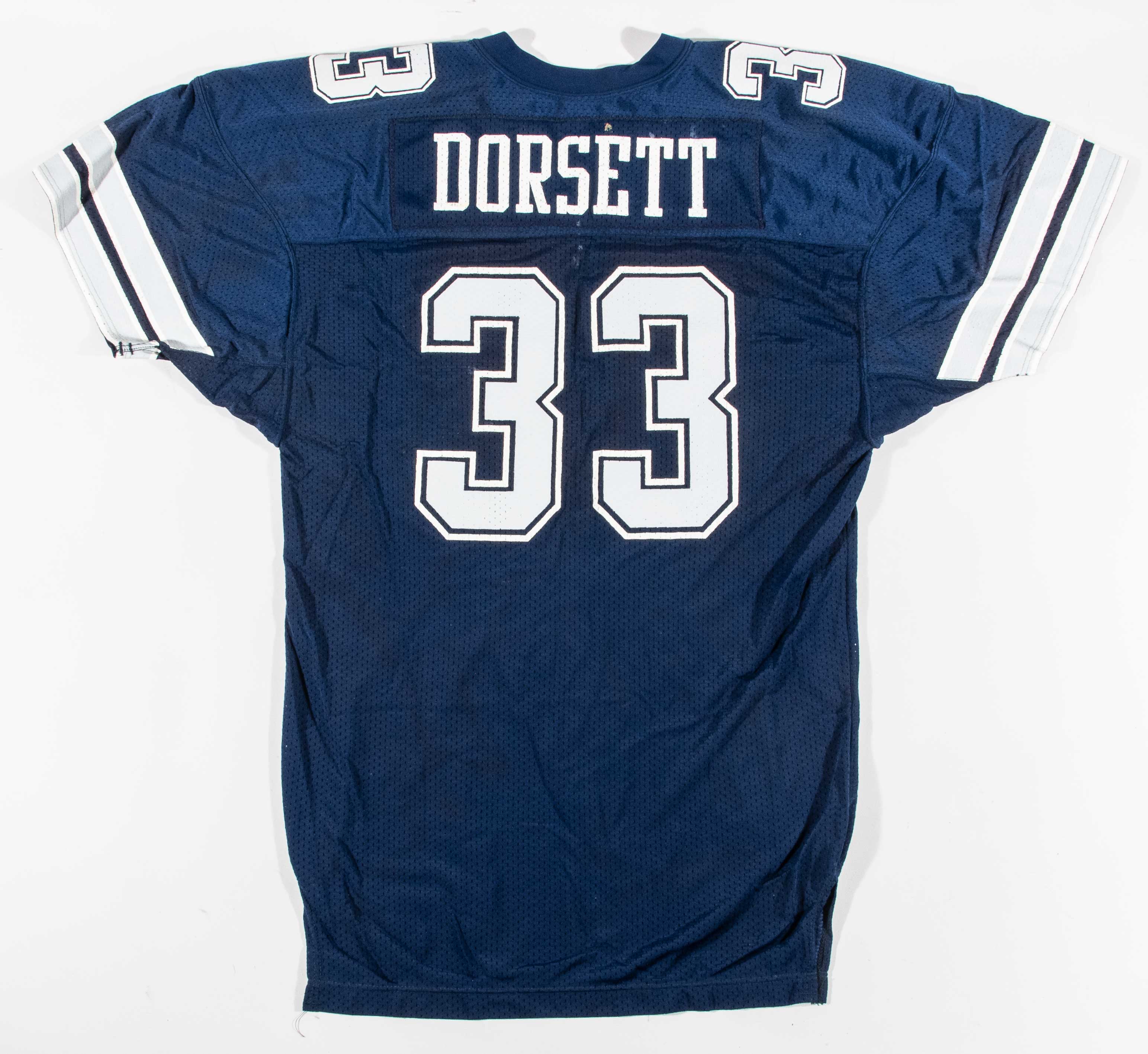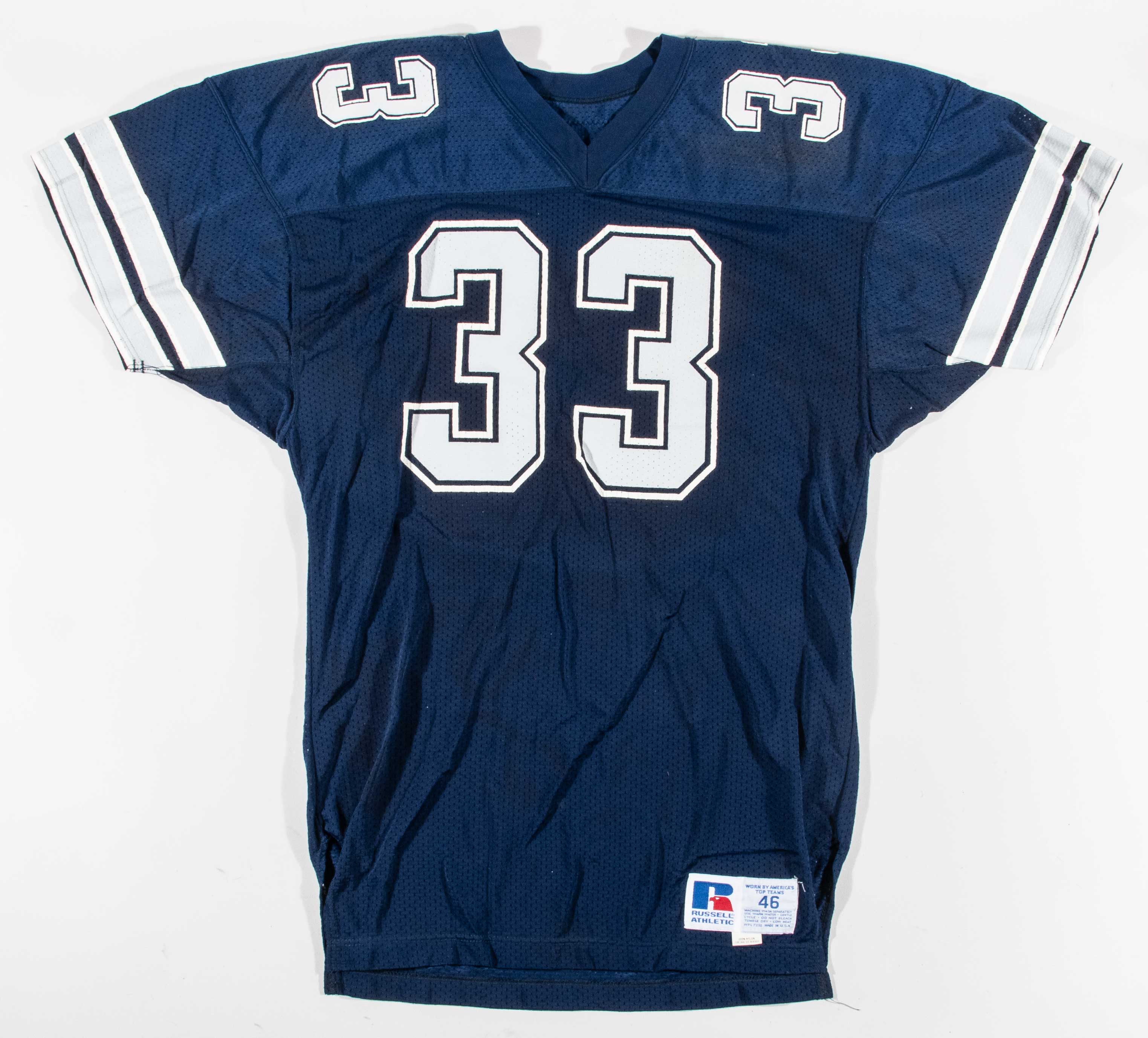 Description:Very fine Tony Dorsett professional model Dallas Cowboys jersey c.1985-87. Russell Athletic size 46 blue road jersey with "DORSETT" nameplate sewn across the back, along with #33 on the front, back, and shoulders. Russell Athletic tagging is on the front tail, with attached flag tag identifying material and wash care. Excellent use with some small stains on the back and supple fabric associated with use/washings. Includes LOA from Hunt Auctions: EX