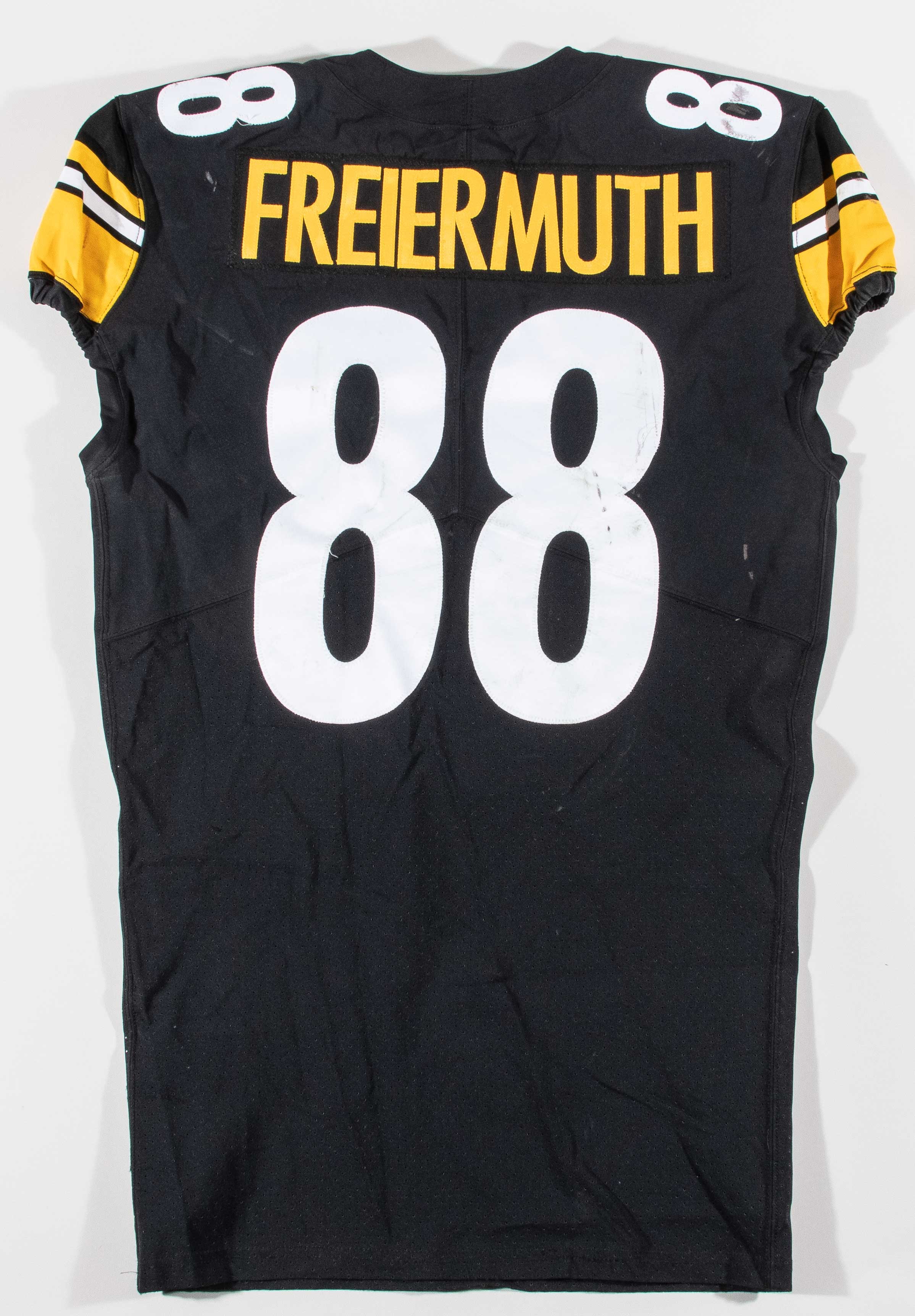 Description:1/3/2022 rookie year Pat Freiermuth professional model Pittsburgh Steelers game worn jersey (strong use, Getty photo match, Steelers Pro Shop authentication). Black mesh jersey has number "88" on the front, back, and shoulders. There is a "Freiermuth" nameplate across the back. Nike On Field L-BK tag in the collar (along with supplemental flag tags) is covered by a custom padded pouch which was likely added to hold a covid detector or contact tracing device. Wash tag inside has affixed "Steelers Authentic Memorabilia" hologram (number GU-116385) and their online database confirms it was game used on January 3, 2022 (5-receptions for 22-yards vs Browns). Strong use is evident throughout, and staining on the front numbers appears to be an exact match of an image taken of Freiermuth during the game played at Heinz Field (Getty: 1237590464): EX
