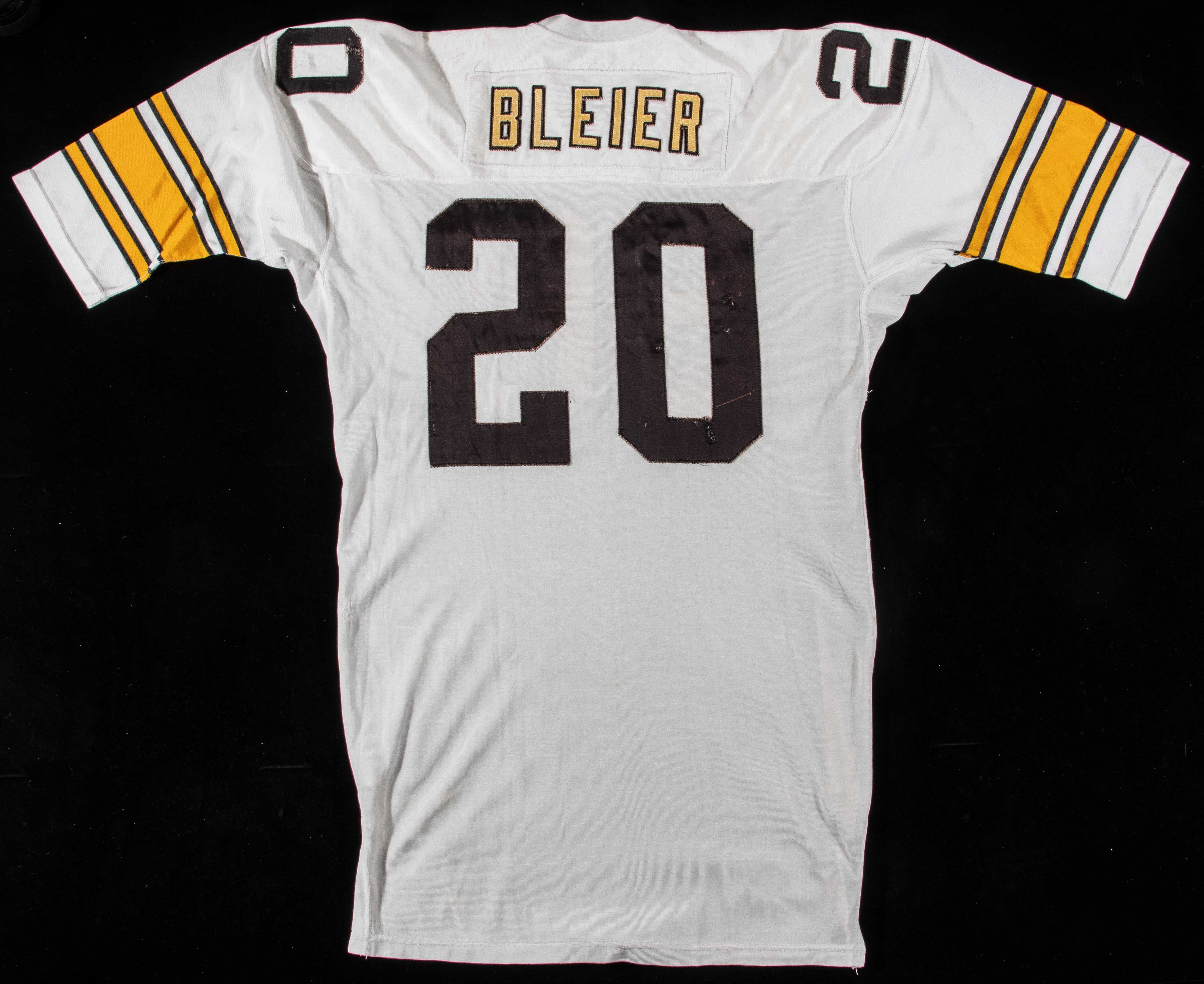 Description:Very fine 1978 Rocky Bleier professional model Pittsburgh Steelers game worn jersey (Super Bowl championship season, Art Rooney II signed letter & MeiGray photomatch). White jersey with black and yellow sleeve accent stripes has number "20" on the front, back, and shoulders. A "BLEIER" nameplate is on the back. Medalist Sand-Knit "Designed & Tailored Exclusively…" tag is on the front tail with an additional below noting size (46). Printed "78" year tag is to one side. Strong use and wash wear are evident throughout including multiple team repairs. MeiGray photomatched the jersey to their 12/16/1978 game vs Broncos (2-receptions for 9-yards plus 11-yards rushing). In addition, it is accompanied by a letter signed by Art Rooney II confirming it was used, and stating that it long resided in the Steelers equipment repository. Bleier's story is the stuff of legend, having been drafted into service following his rookie season. He returned from Vietnam wounded and unable to walk, told that his days playing football were over. Not one to relent, he regained his abilities and would go on the become one of the most popular members of the 1970s Steelers dynasty. He would play on all (4) of their Steel Curtain era Super Bowl Championship teams. Includes photomatch documentation from MeiGray in addition to the LOA signed by Rooney: EX