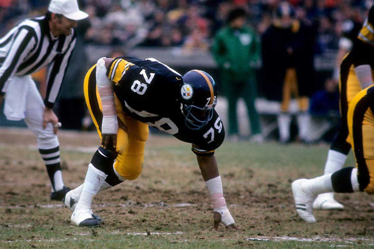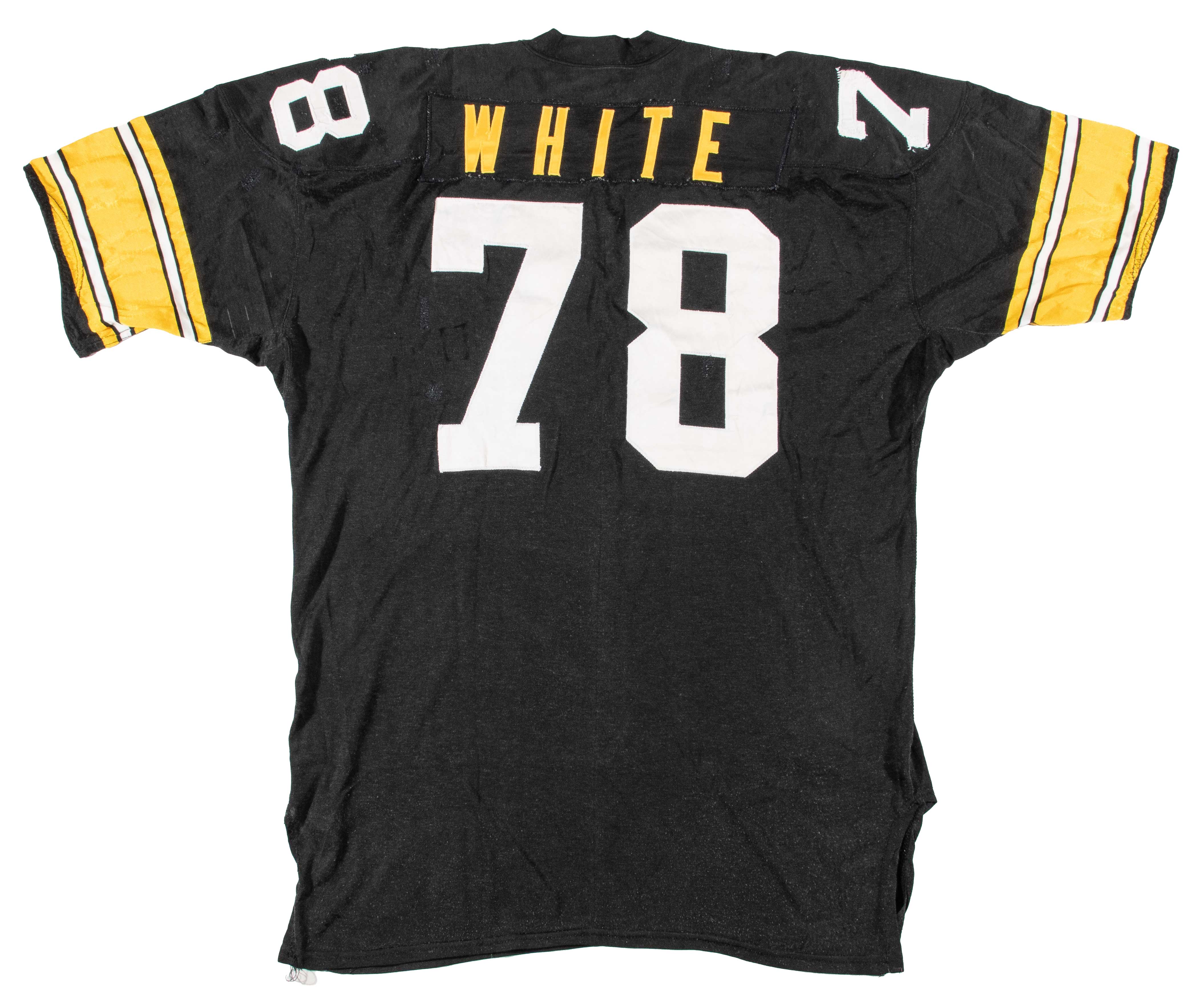 Description:Dwight White professional model Pittsburgh Steelers game worn jersey c.1972 (extensive wear & team repairs, Steelers Pro Shop authentication, Art Rooney II letter, MeiGray). Black jersey has number "78" on the front, back, and shoulders and here is a "White" nameplate across the back. Sand-Knit "Designed & Tailored Exclusively..." tag is on the front tail with additional below noting size (52). Incredible use is evident throughout including numerous team repairs which cover a large area of the upper portion. "Steelers Authentic Memorabilia" hologram affixed inside (number GU-111609) can be confirmed in their database as "game used." Includes a letter signed by Art Rooney II which further confirms the same, along with LOA from MeiGray (serial #160204) noting the jersey's game use. White was a member of the famed Steel curtain defense which helped power the Steelers to (4) Super Bowl Championships. He remains one of the most beloved players in Franchise history: EX