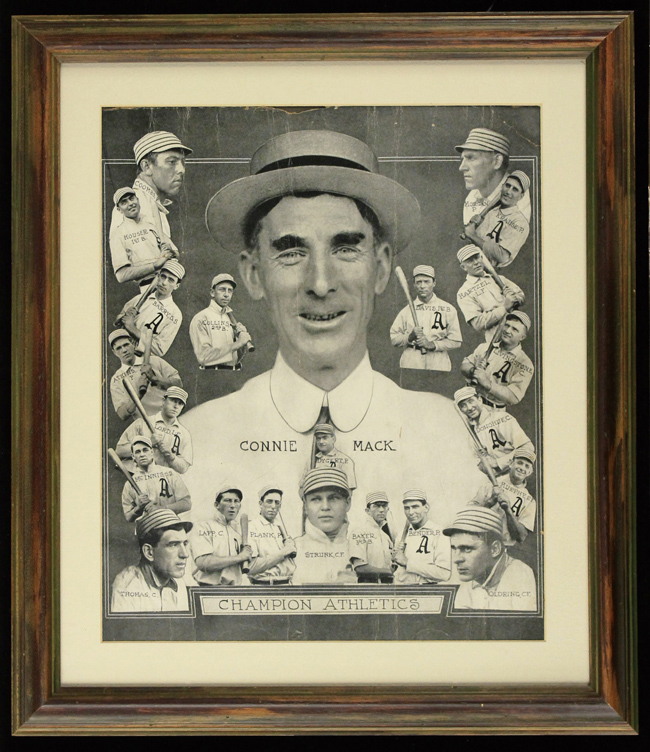 Description:"Champion Athletics" - 1910 Philadelphia Athletics large format composite display piece (VG) Period display piece having large portait of Connie Mack at center with "Champion Athletics" titling below. Individual players pictured throughout including Bender, Baker, Plank, McInnis, Collins, and Lord. Chip at top edge with series of light vertical creasing throughout: Framed for display: VG ($500-$1,000)