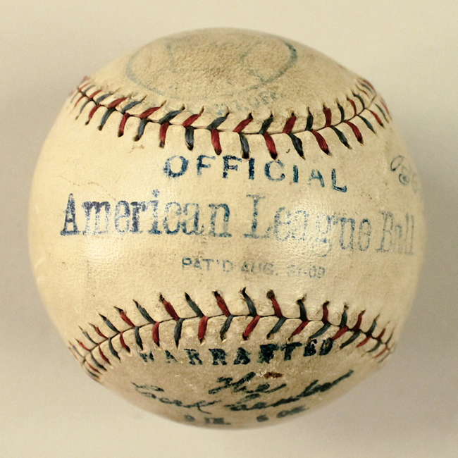 Description:Reach Ban Johnson Official American League baseball c.1910s-20s (VG/EX - see description) Red and blue stitched Reach brand Official American League baseball with "B.B.Johnson" facsimile signature on side panel. Ball displays mild even toning with light scattered wear. Touch of fading to stampings which still offer fine display qualities. There is a faded vintage fountain "Babe Ruth" clubhouse signature just off the sweetspot: VG/EX ($300-$500)