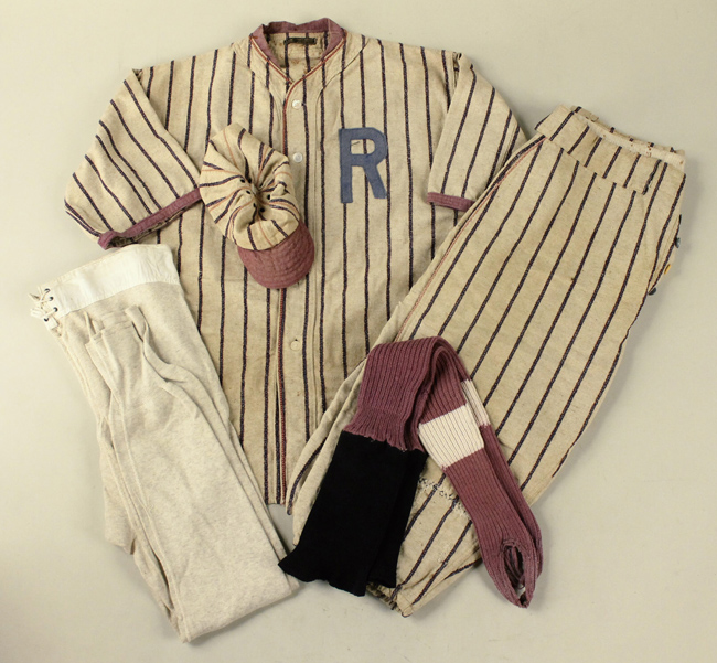 Description:Early Draper & Maynard brand baseball uniform c.1910s-20s (Overall EX display value) Pinstriped flannel jersey and pants with matching hat includes pair of long underwear and stirrup socks for display. Jersey and pants have "Draper & Maynard" tagging, hat has small frayed tag which is not at all descernable as D&M however the material is a match. All (3) pieces combine for a fine display however there is varying degrees of wear throughout including some heavy repairs to pants: Overall EX display value ($200-$400)