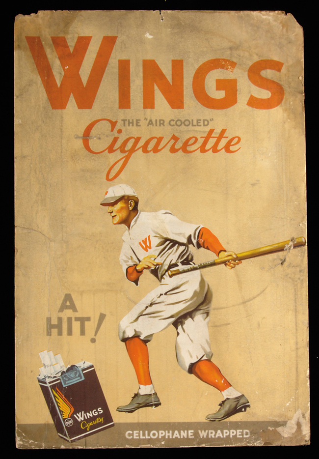 Description:"Wings Cigarette" baseball themed large format advertising display c.1940s (PR/GD) Large 24"x36" heavy cardboard stock advertising piece with "Wings The Air Cooled Cigarette" titling at top. Batsman below with "A Hit" captioning and image of package of product. Heavy wear throughout including chipping, toning/staining, a bit of water damage, creasing, and several small tears. Easle back remains intact. Despite extent of noted wear the piece still retains eye appeal and if framed would be a nice period display piece: PR/GD ($150-$300)