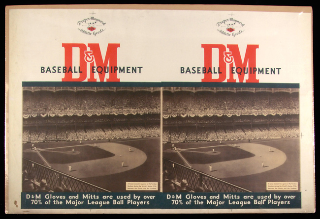 Description:Rare Draper & Maynard advertising poster c.1936-1937 (EX) Highly visual pair of identical period advertising posters on a large single sheet as printed. Famed company lucky dog logo at top with "D&M Baseball Equipment" titling. Game action scene below is captioned "A tense moment in a game at the Yankee Stadium during the World's Series in 1936, between the Giants and Yankees." Measures 30"x44.25" overall with left side poster having just a hint of light toning and some scattered surface wrinkling effecting area which would be visible if separated and framed for display. Right side poster in similar condition with additional wear including tear (extending approx. 2" into green border) at lower corner. Fine pairing being the first of their type we have handled: EX ($750-$1,000)