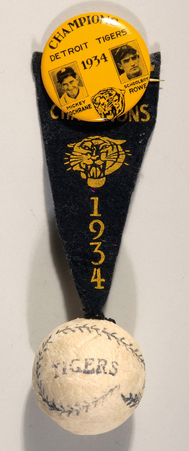 Description:"1934 Detroit Tigers Champions" souvenir pin picturing Cochrane and Rowe with original pennant/ribbon and ball charm (Pin NM, Pennant/ball VG-EX) Uncommon 1.75" souvenir pin remains in outstanding NM condition with little to no mentionable wear. Remaining affixed is the original black felt pennant shaped lower portion with similar screened on yellow "Detroit Champions 1934" titling and tiger face at center. At tip of pennant is plush ball with printed on "Tigers" team name and simulated stitching. Pennant/ball display mild/moderate wear/toning: Pin NM, Pennant/ball VG-EX ($750-$1,000)