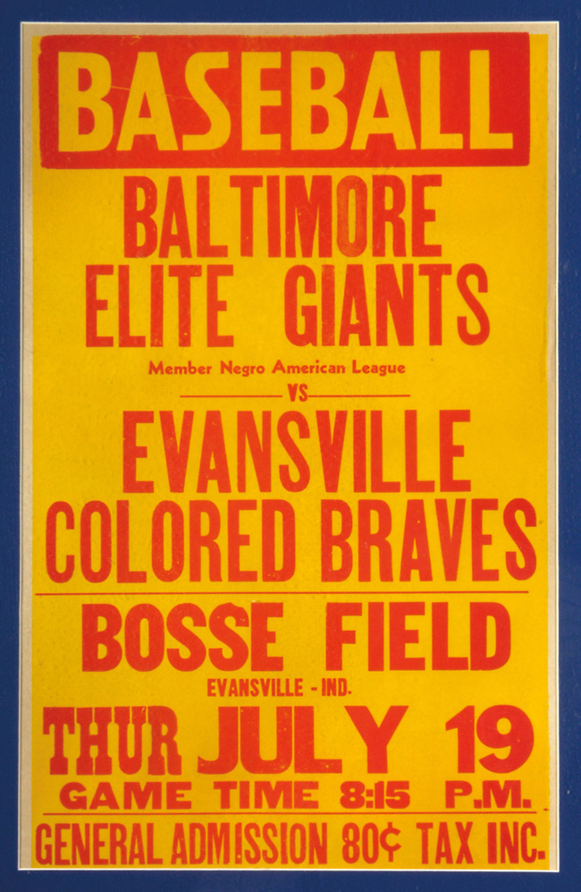 Description:Baltimore Elite Giants vs. Evansville Colored Braves Negro League advertising broadside c.1940s (EX/MT-NM) Desirable period advertising piece featuring bright red titling set against rich yellow background. Very well preserved with a few very light scattered surface wrinkles. Framed for display: EX/MT-NM ($500-$1,000)