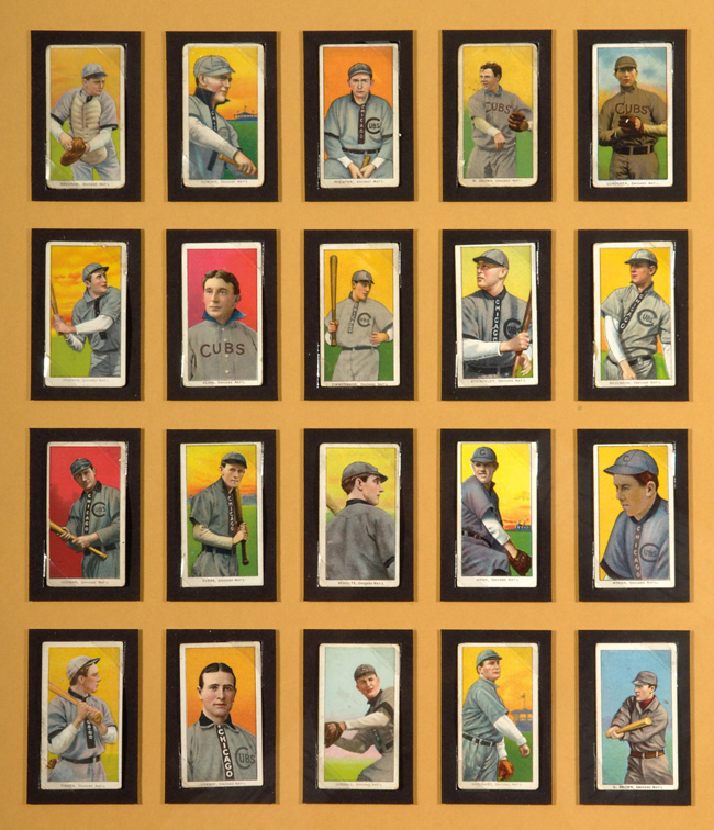 Description:1909-11 T206 Chicago Cubs team set of (20) cards incl. (4) Hall of Famers (see description) Tasteful display (22.75"x24.75" overall) housing a total of (20) original T206 cards of Chicago Cubs team members incl. Chance, Tinker, Evers, Brown, Needham, Howard, Pfeister, Lundgren, Pfeffer, Kling, Zimmerman, Steinfeldt, Reulbach, Hofman, Schulte, Kroh, Moran, Overall, Sheckard, and G.Brown. Only card fronts are visible and our condition assesment is only based on those; we are unaware of back types or condition. Cards have light to moderate touch to corners with some scattered edge wear/chipping. It appears that approx. half have some imperfections as a result of being placed within the corner mounts which secure them inside the frame. Minimal light creasing effects a handful. Light wear to frame: see description ($1,000-$1,500)