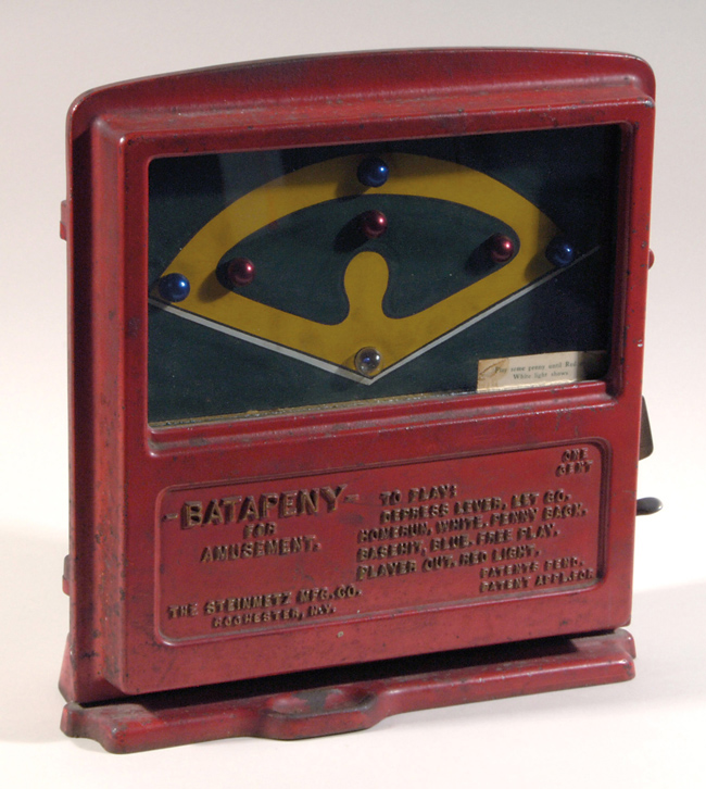 Description:Rare "Batapeny" coin operated game c.1925 (EX) Seldom offered electronic tabletop game featuring a cast iron enclosure with a painted field of play which has light bulbs at each player position. "Batapeny" titling in raised lettering on front along with playing rules and "Steinmetz Mfg. Co." marking. Light scattered wear and a touch of surface loss. Our consignor has relayed that it is in working order however this cannot be tested/guaranteed as a special battery is required. Key not present. One of the rarest of all tabletop games: EX ($1,000-$2,000)