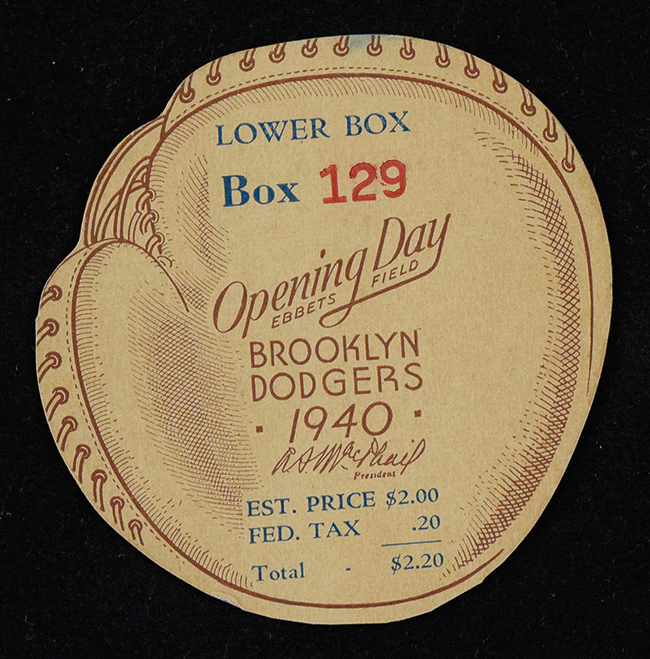 Description:1940 Brooklyn Dodgers Opening Day die-cut ticket stub (EX/MT display value with back damage) Desirable original die-cut glove shaped ticket stub issued for Opening Day game played at Ebbets Field. Displays at the EX/MT level with hint of visible wear and a very small spot of discoloration at top. Back has small spot of paper loss and a pair of vintage fountain pen signatures: EX/MT display value with back damage
