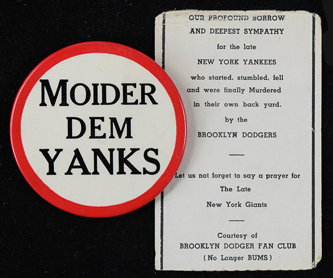 Description:1955 Brooklyn Dodger Fan Club "Profound Sorrow and Deepest Sympathy" card with "Moider Dem Yanks" pin (VG and EX/MT) Includes paper stock mourning card issued by the Brooklyn Dodger Fan Club with text reading in part, "Our Profound Sorrow And Deepest Sympathy for the late New York Yankees who started, stumbled, fell, and were finally Murdered in the their own back yard by the Brooklyn Dodgers..." Card measures approx. 2.5"x3" and has mild wear at top edge and lighter wear along bottom with small chip to lower right corner; period 2.5" souvenir pin which reads "Moider Dem Yanks" and has a touch of very light wear: VG and EX/MT