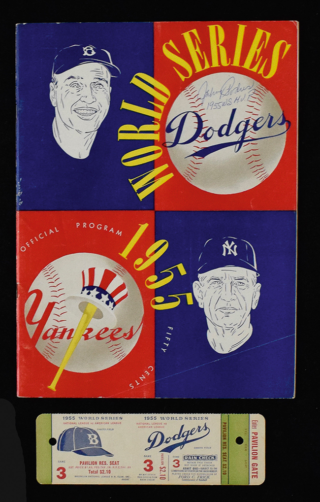 Description:1955 World Series Game (3) full proof ticket with original program signed by MVP Johnny Podres (Sig. NM, Ticket/Program EX/MT) Includes full proof ticket (not intended for use) issued for the game played at Ebbets Field which was won by Johnny Podres. Overall NM appearance with a hint of extremely minor toning and little mentionable wear; Dodgers version of the 1955 World Series program which has been signed on the cover, "Johnny Podres 1955 W.S. M.V.P." (ink rating 9/10 out of 10). Unscored with a touch of corner and edge wear. Front cover has a angled crease at lower right corner: (Ticket/Program EX/MT, Sig. NM)