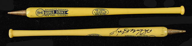 Description:1941 Yankees vs. Dodgers World Series souvenir pencils with (1) signed by Joe DiMaggio and Dolph Camilli (EX/MT) Pair of celluloid mechanical pencils each have printed on "1941 World Series" logo and were done in the period to commemorate the event. One has been signed in marker by both Joe DiMaggio (8/9 out of 10) and Dolph Camilli (7). Each has some very minor surface discoloration. Includes the original box (which has modern label affixed to lid): EX/MT