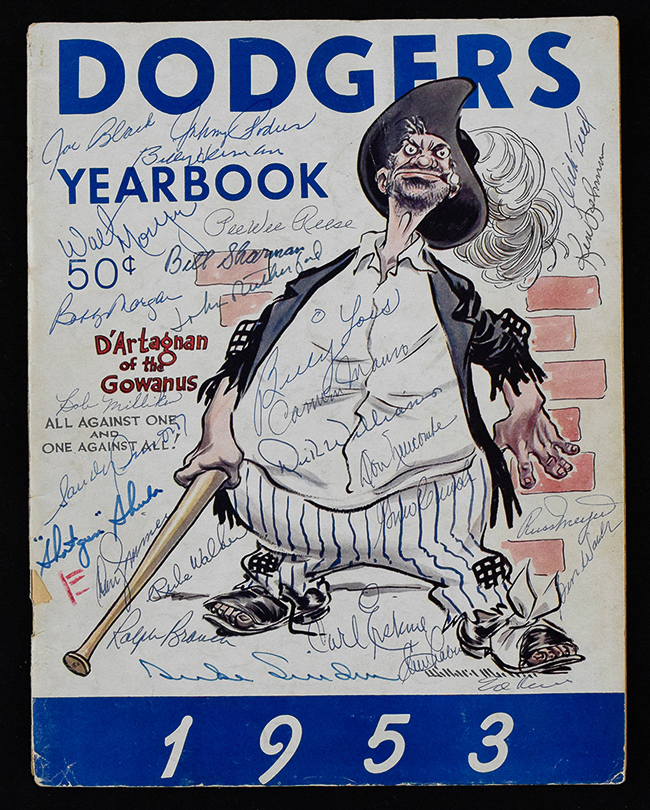 Description:1953 Brooklyn Dodgers yearbook signed by (26) incl. Snider, Reese, and Bill Sharman (full JSA LOA) (Sigs. EX/MT-NM, Yearbook (GD) Original team issued yearbook has been signed throughout the cover by (26) incl. Pee Wee Reese, Duke Snider, Bill Sharman, Bick Williams, Billy Loes, Sandy Amoros, Joe Black, Billy Herman, Johnny Podres, Shotgun Shuba, Don Zimmer, Ralph Branca, Don Newcombe, Russ Meyer, Carl Erskine, Clem Labine, Ed Roebuck, and others. Ink and marker signatures rate 8 to 9 out of 10. Yearbook itself has light corner and edge wear, mild toning, and separation (along with small chip) to portion of bound edge. Includes full LOA from JSA: Sigs. EX/MT-NM, Yearbook GD