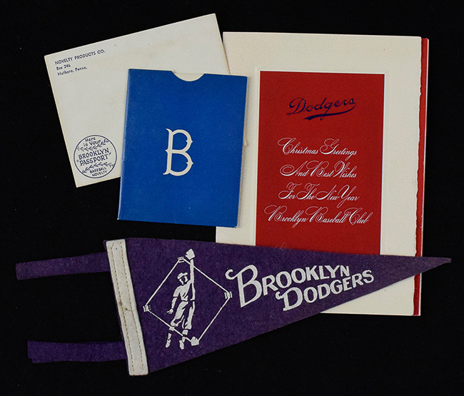 Description:Nice lot of (4) c.1940s-50s Brooklyn Dodgers pieces incl. "Passport", Christmas card, stationary, and mini-pennant (Range VG-NM) Includes a sheet of blank 8.5"x11" Dodgers team logo stationary (lightly toned with faint outline of mini-pennant); purple felt 9" mini-pennant with screened on text and graphic (tack holes from mounting); Dodgers Christmas card which has small "12/25/42" date notation written on otherwise blank inside; and c.1955 "Brooklyn Passport" with original envelope. Inside is a blue team logo paper stock holder which contains a folded "Passprt To The Most Beautiful State Of Mind" extolling the virtues of the team which won the 1955 World Series (touch of toning/wear to envelope, contents EX/MT-NM): Range VG-NM