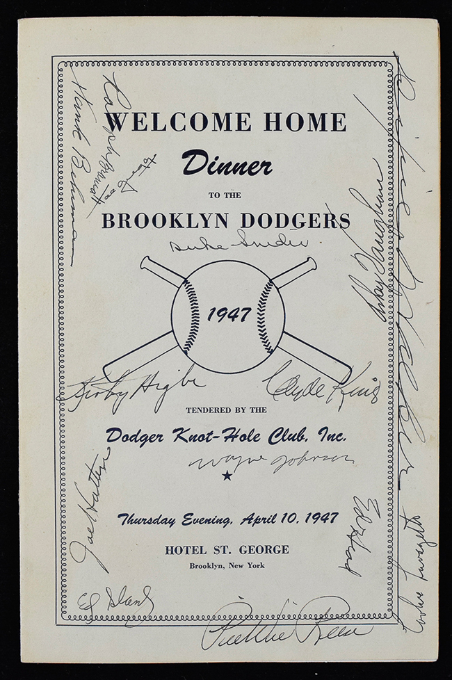 Description:1947 Brooklyn Dodgers Welcome Home Dinner program signed by (13) incl. Arky Vaughn, Pee Wee Reese, and Duke Snider (EX/MT-NM) Original heavy stock program as issued for the April 10, 1947 event has a hint of light wear and natural age toning. Signed on the front cover by (13) incl. Vaughn, Snider, Reese, Gregg, Behrman, Higbe, Hatten, Stanky, Head, King, Lavagetto, and Walker. Fountain pen signatures rate 8 to 8/9 out of 10: EX/MT-NM